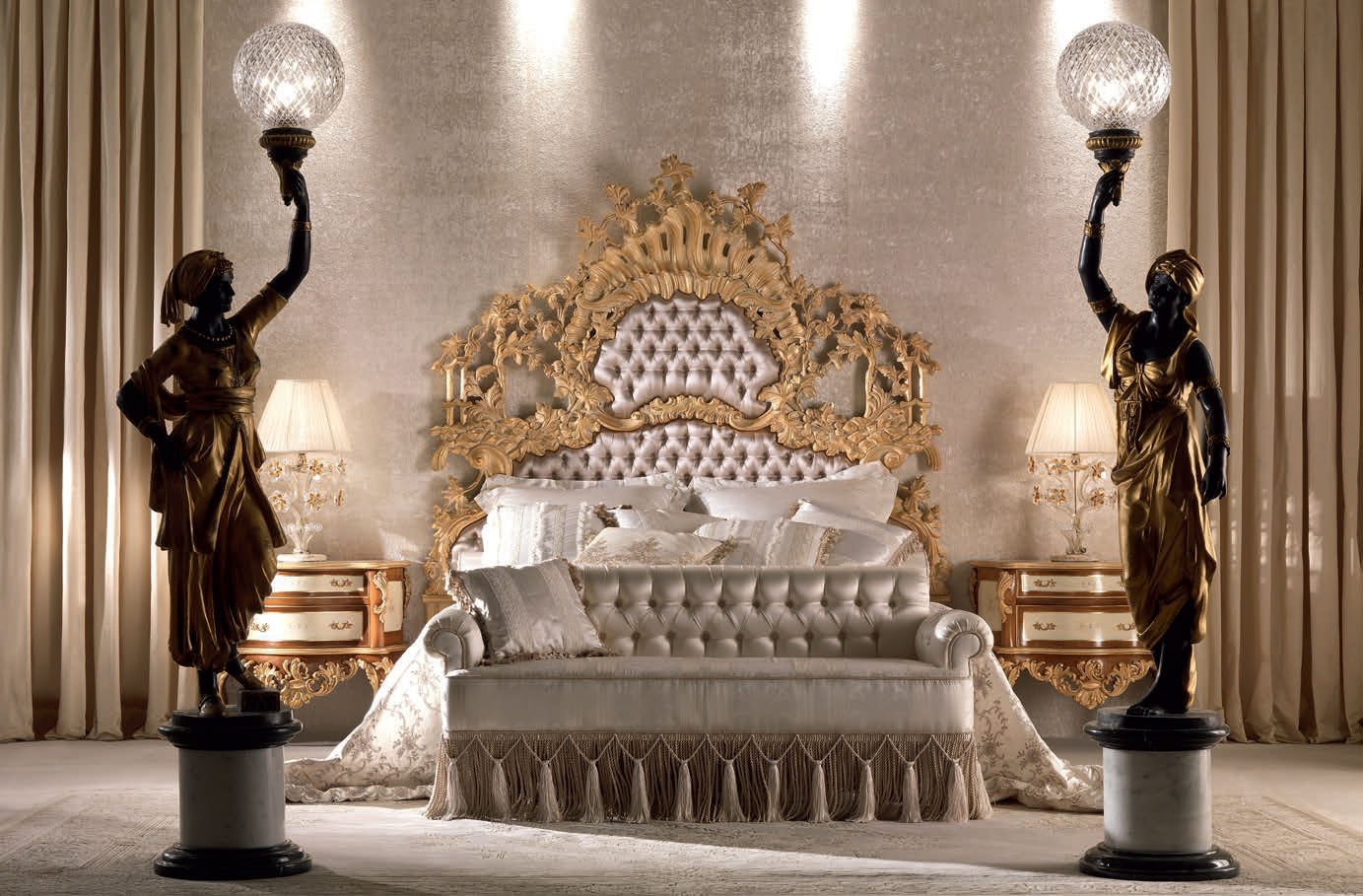 Double bed from Italian manufacturer Jumbo Collection, the Versailles collection. The frame is made from solid wood, decorative elements in gold plated finish. Upholstered headboard, filler - foam, upholstery - textiles from a range of campaigns. The model will perfectly complement the interior in a classic style.