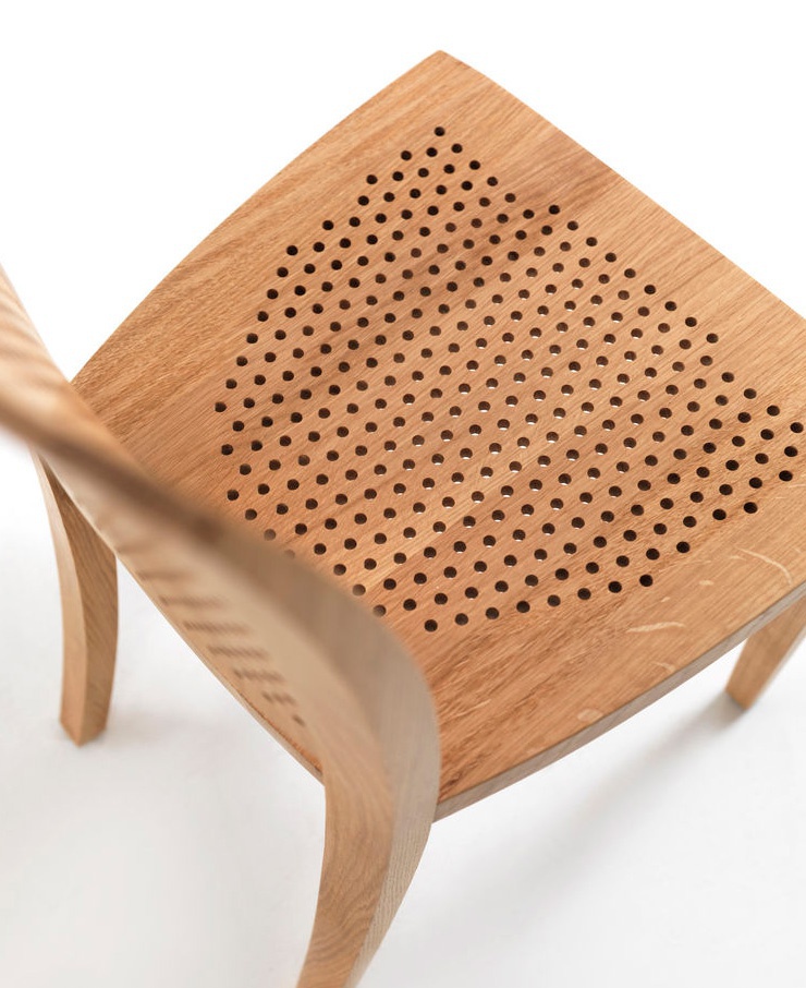 Chair Pimpinella Light from the Italian manufacturer Riva 1920. The model is made of wood. In the seat and the back holes which gives the chair lightness. Designed in a contemporary style.
