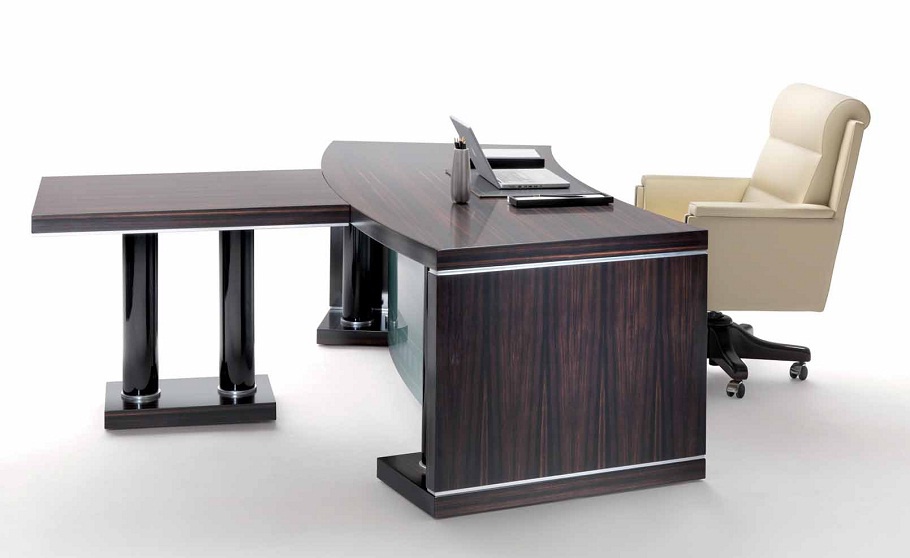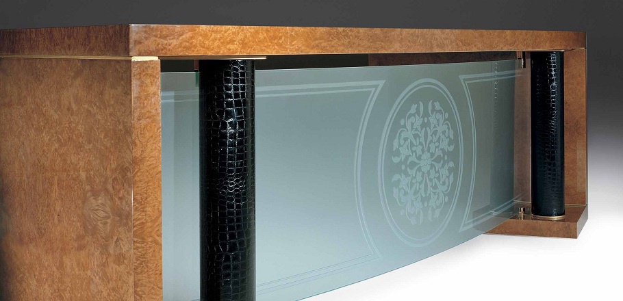 Writing table from the Italian manufacturer Elledue. Table top, legs made of natural wood. The model is presented in 2 versions: coating with a pronounced luster that acts as the decor, and the same model with leather corrugated elements. Under the table top - glass partition, frosted. Colors - in stock. A great choice for the office in modern style.