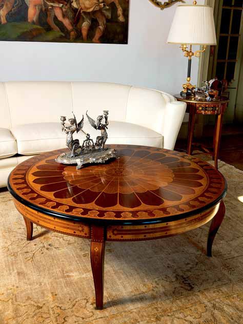 Coffee table T71/C Italian manufacturer Zanaboni. Presents round table shape for small feet, made entirely of wood. The table top is decorated with carved patterns. Color scheme in the combination of light and dark tones of natural wood. The performance style of the Baroque.