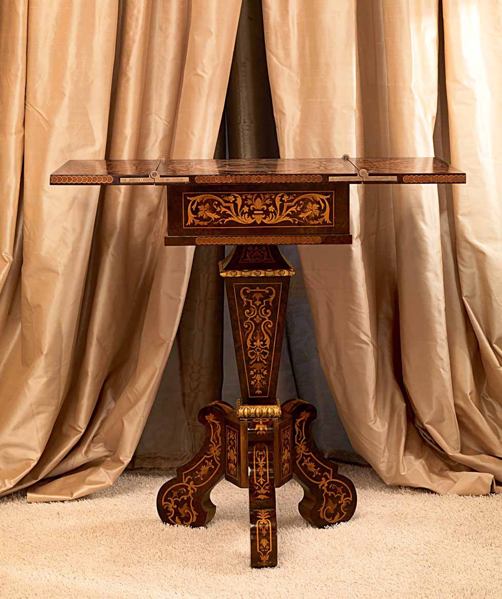 Folding table T75 Italian manufacturer Zanaboni. Presents a model of a folding table with modulated as needed top. Wooden patterns, bright colors. Designed in the Baroque style.
