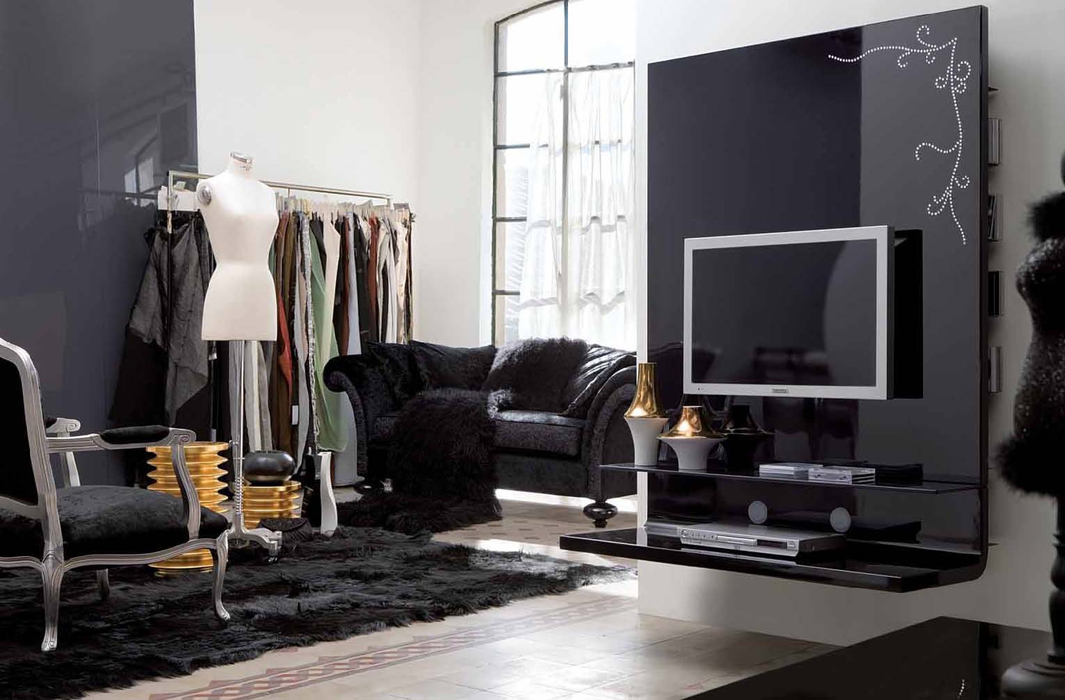Module for TV Look Vanity from Italian manufacturer Moda. Furniture made of solid wood in lacquer processing. Color black, possible variations in the catalog of the manufacturer. Glass shelf for equipment and a small storage compartments for the main body. In the centre mount for TV. The facade is inlaid with a pattern of stones. The module-style glamour.