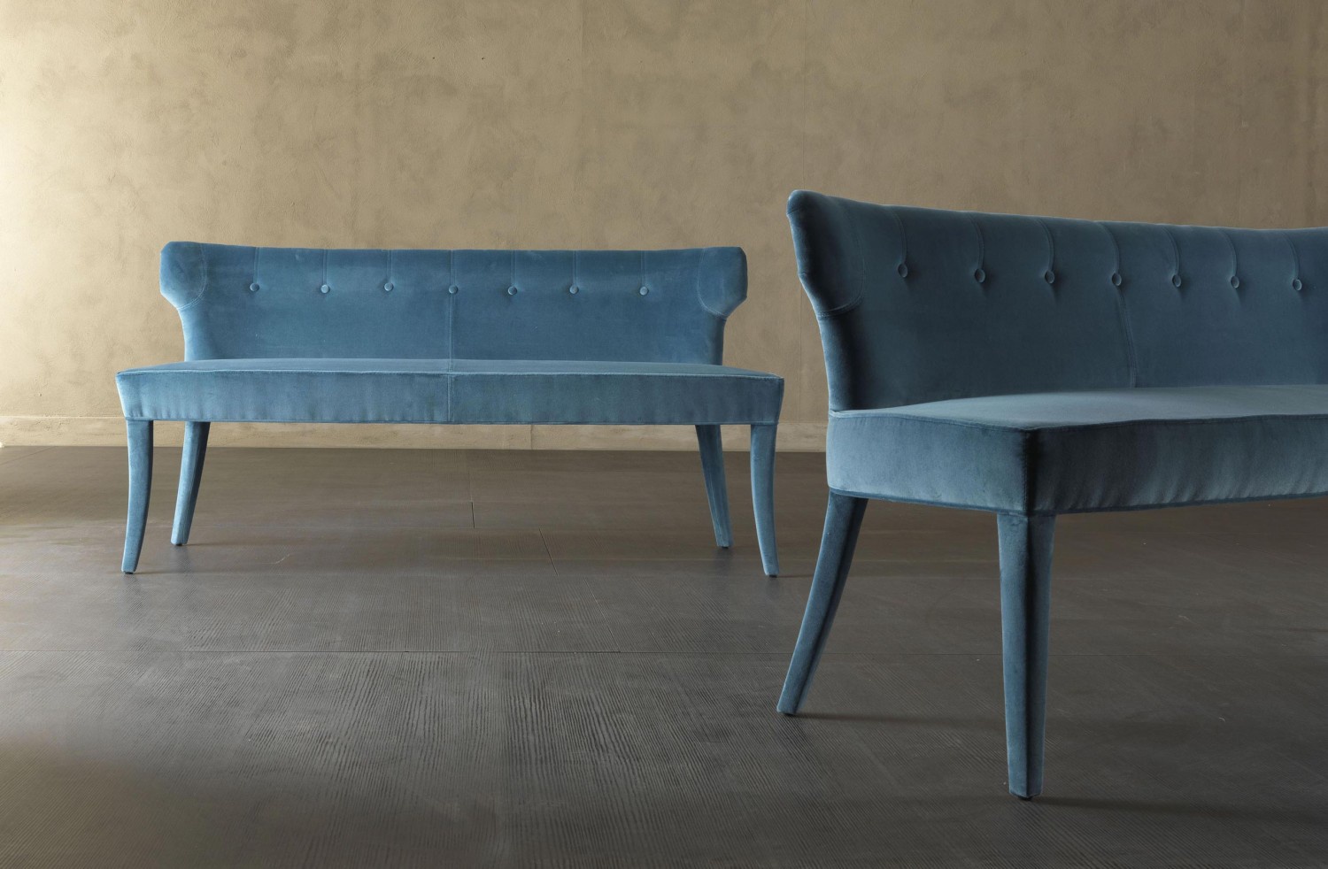 Bench Guendalina from the Italian manufacturer Rugiano. Model with shaped backrest. The legs are made of solid wood, can be covered with leather or textile. Skeleton models made of wood, filler - polyurethane foam of different hardness. Upholstery textiles or leather colours to choose from a catalog company. The back is decorated with ornamental stitch-Capito. The model perfectly fit into the interior of a modern living room, bedroom or hall with elements of art Deco.