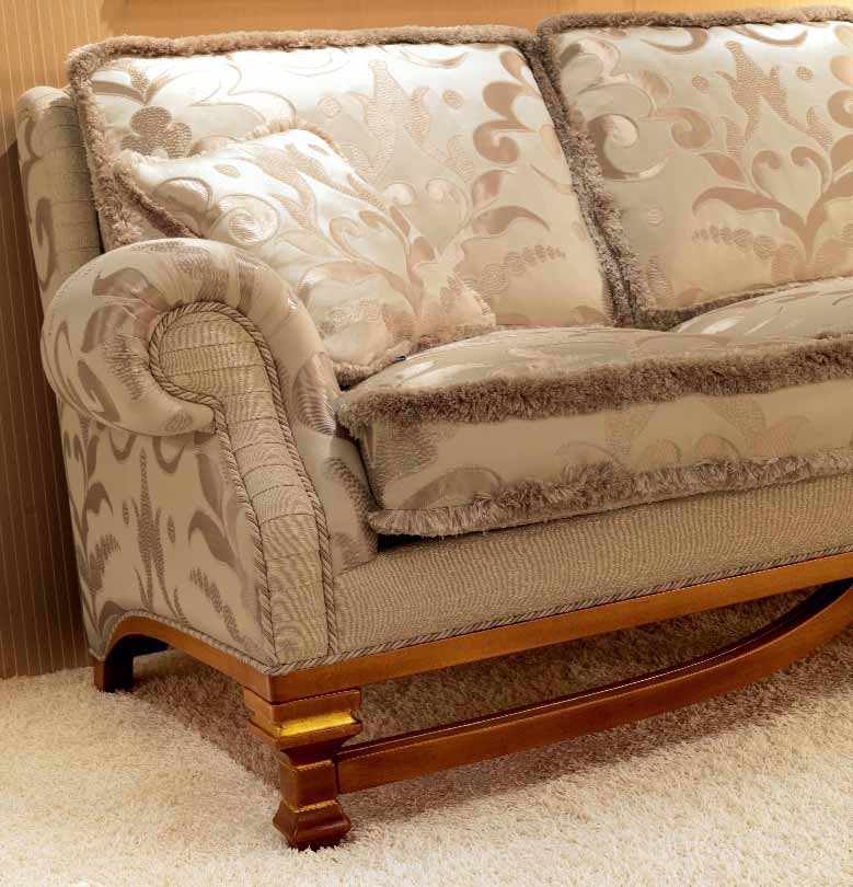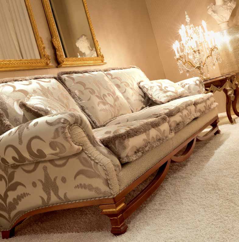 Montecarlo sofa set Italian manufacturer Zanaboni. The presented model three-seater sofa, armchairs and round coffee table. Sofa upholstery from high quality textiles, carcass furniture from natural wood. Table on carved legs with gold plated, countertop is white marble. The perfect solution for an interior in Baroque style.