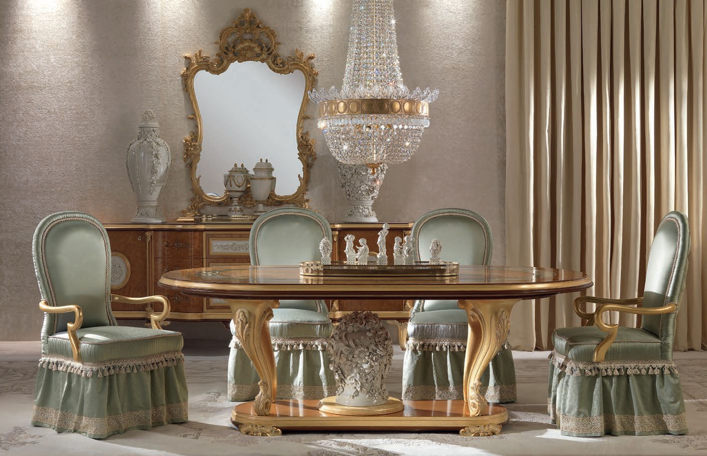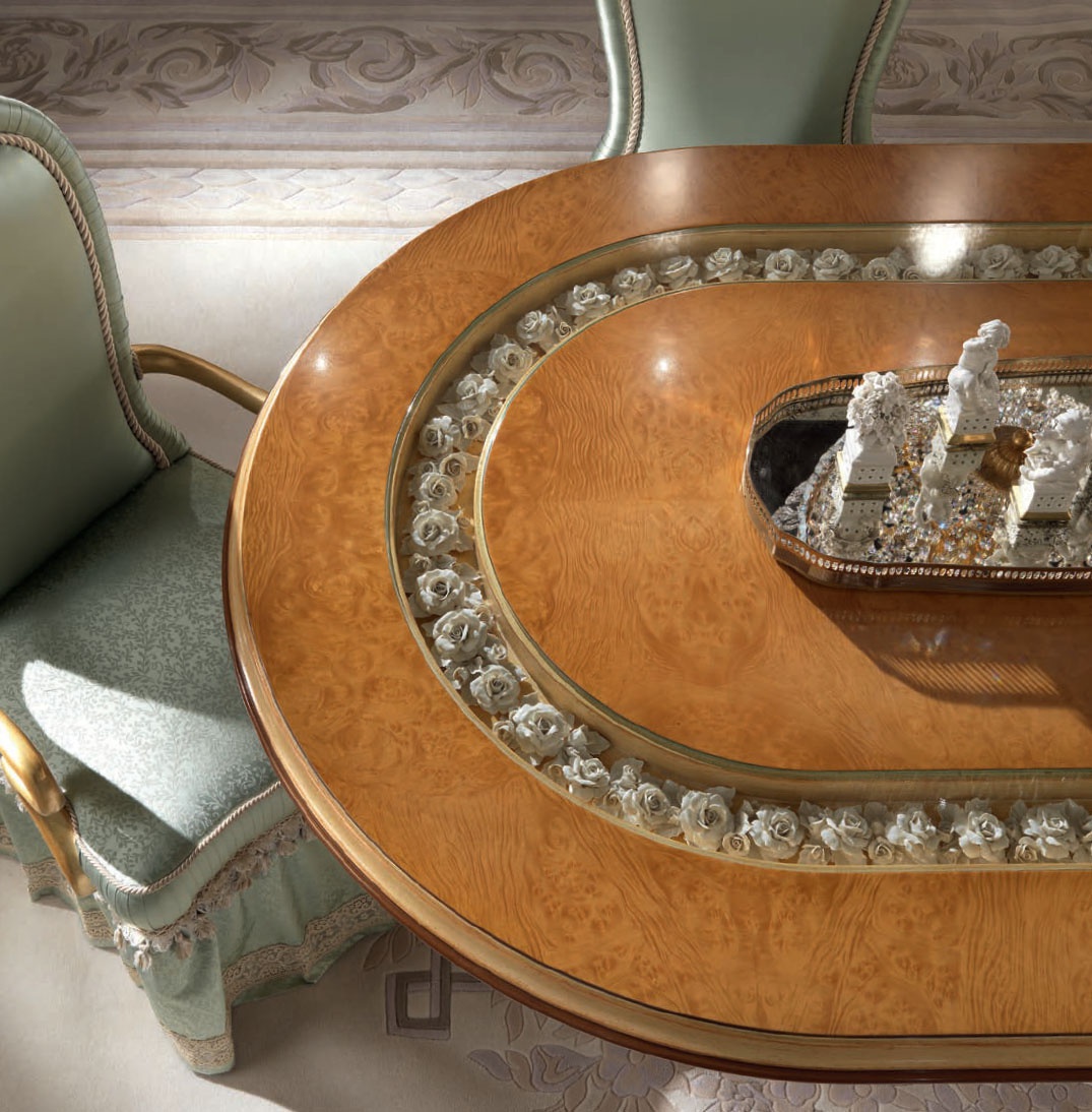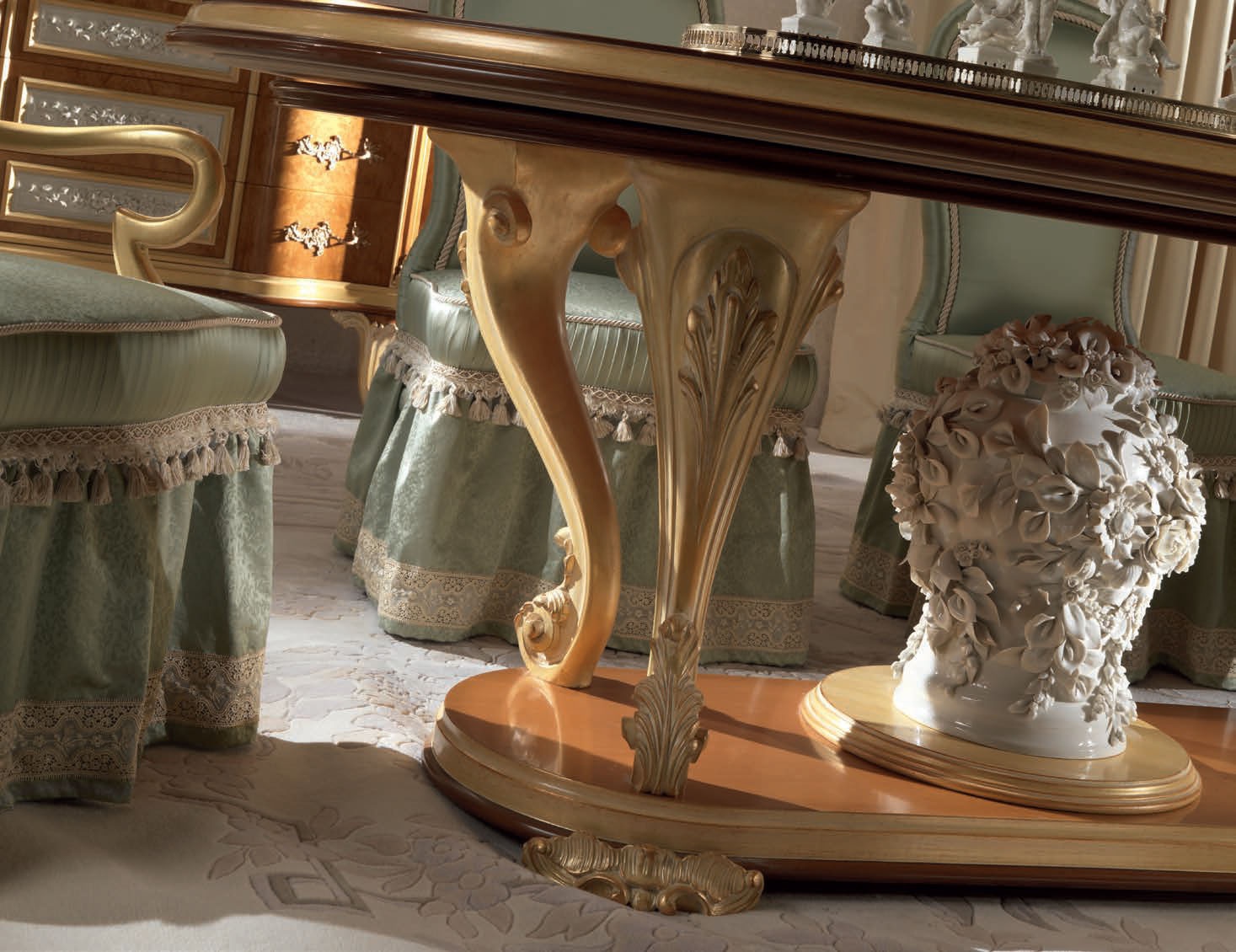 Dining table from the Italian manufacturer Jumbo Collection, Canova collection. Model in the classic style. The frame is made from natural wood carving - handmade in gold plated finish. Colours in stock.