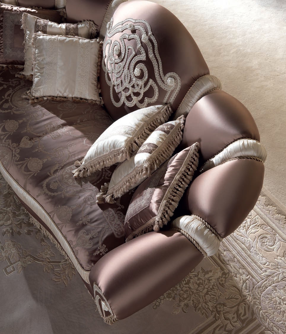 A double sofa from Italian manufacturer Jumbo Collection, Canova collection. Model in the classic style. Frame made of natural wood, upholstery - textiles from the company portfolio. Colours in stock.
