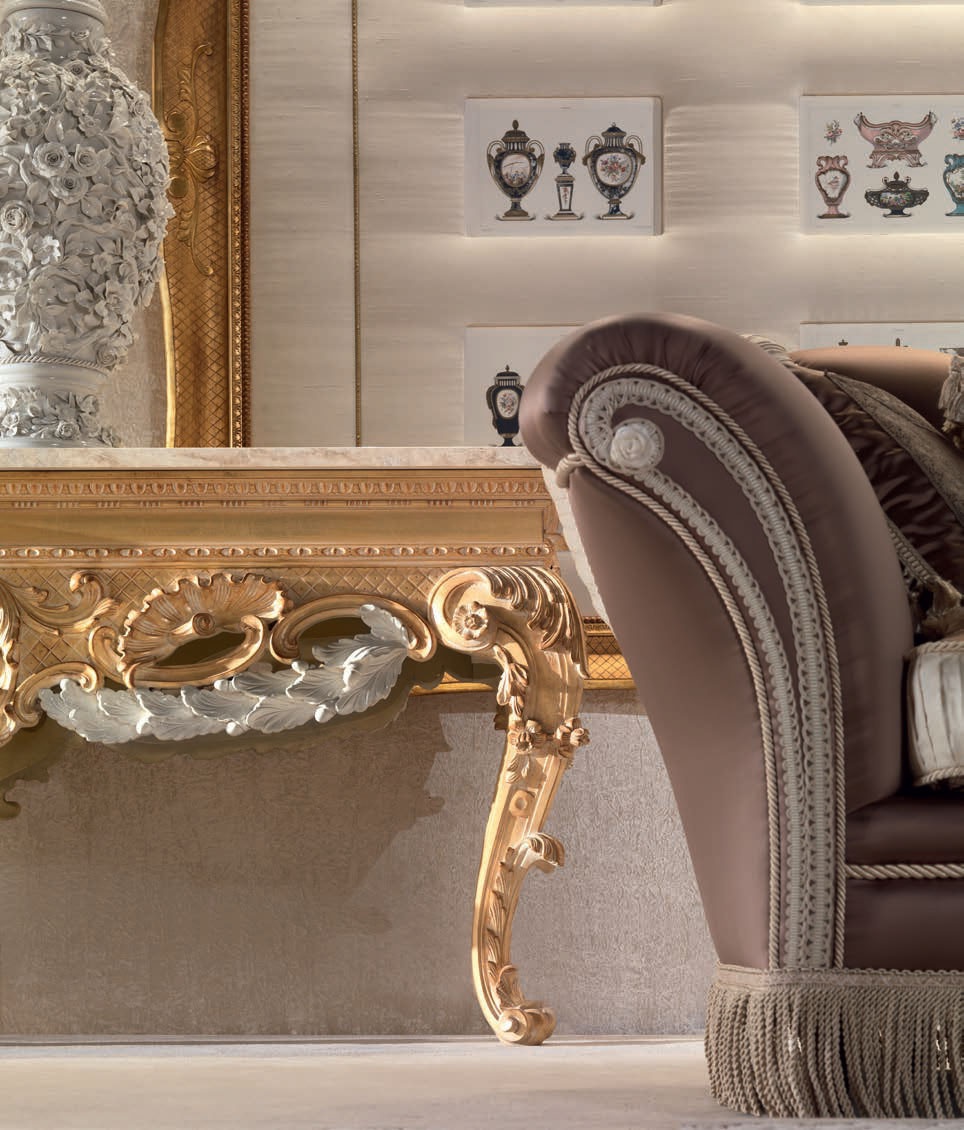 The console is natural wood with marble top from the Italian manufacturer Jumbo Collection, Canova collection. Model in the classic style. The frame is made from natural wood carving - handmade in gold plated finish. Colours in stock.