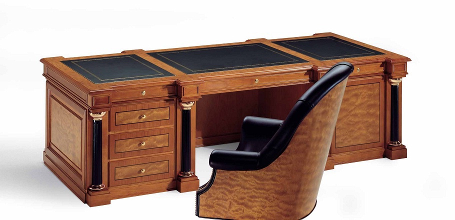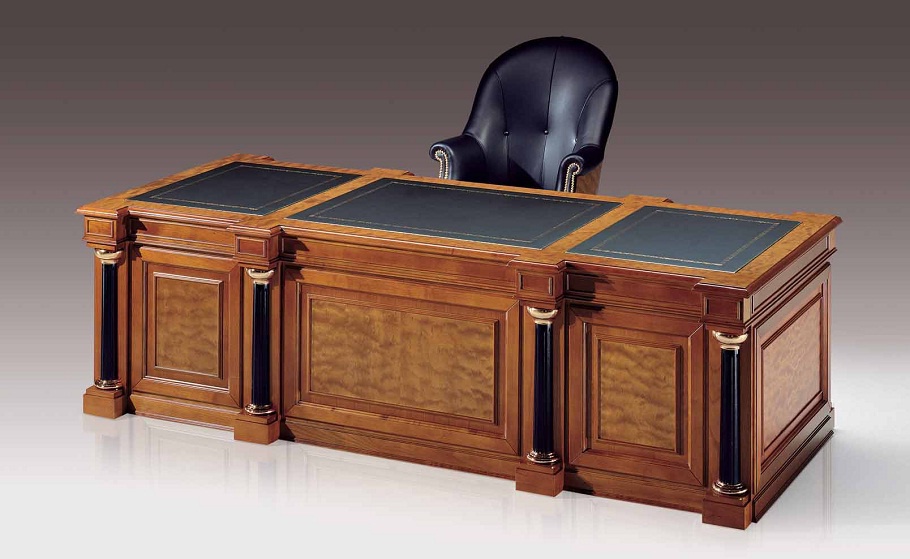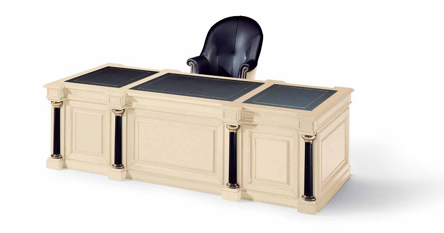 Desk with mobile drawers and console Kingdom from the Italian manufacturer Elledue. Table top, legs made of solid wood cherry and briar, polished, with side is a chest of drawers. Part of the main countertop is a coating of natural leather. D?cor is uncluttered thread and gold plated fittings. Colors - in stock. A great choice for the office in classic style.