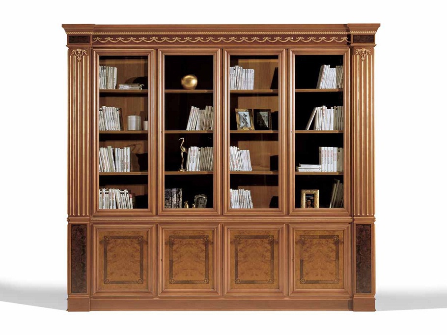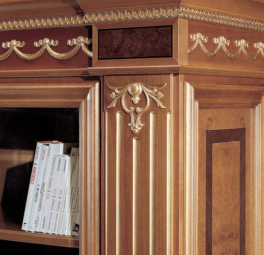 Leonardo bookcase from the Italian manufacturer Elledue. The frame, shelves made of solid hazel and rose hips, lacquered. Top half glazed shutters. D?cor is uncluttered carving covered with gold leaf. Colors - in stock. A great choice for the office in classic style.