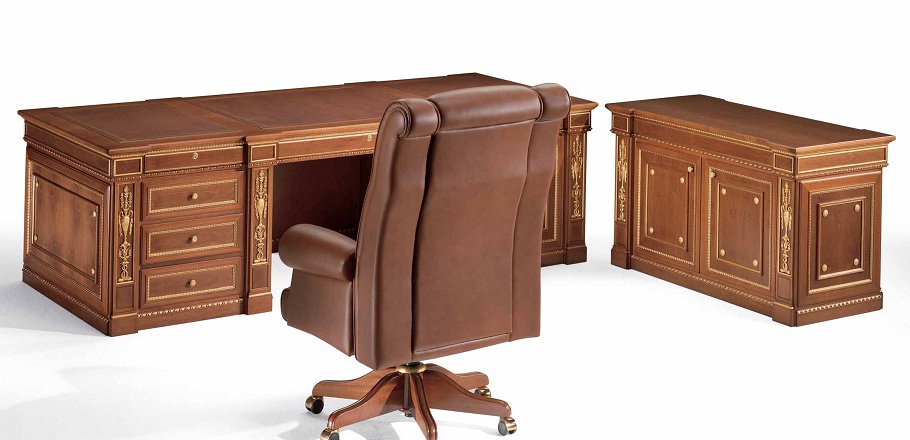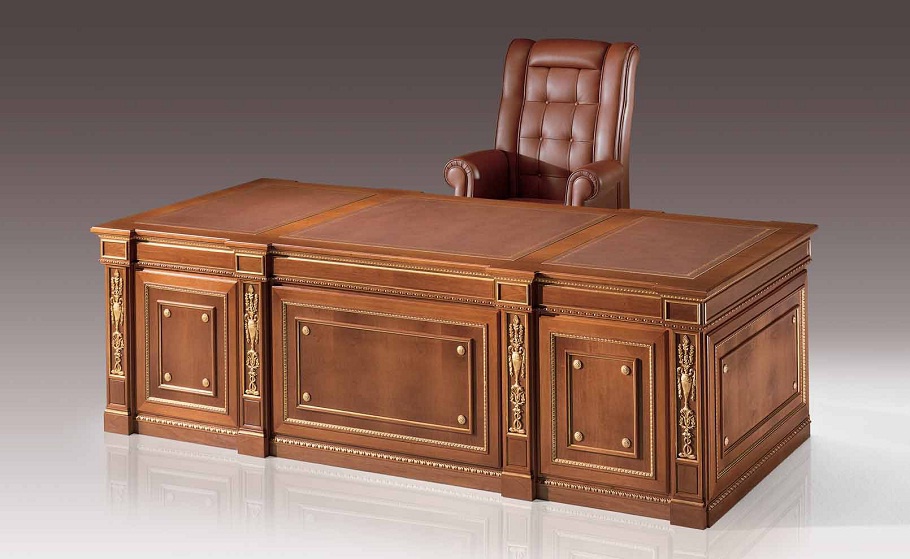 The Louvre Desk from the Italian manufacturer Elledue. Table top, legs made from solid Italian patinated Hickory wood, lacquered. Part of the countertop is decorated with genuine leather. The model is presented in 2 versions: a small Desk with a drawer under the table top, and table with chest of drawers. Element of the decor is carving covered with gold leaf. Colours/varnishing/sizes are back in stock. A great choice for the office in classic style.