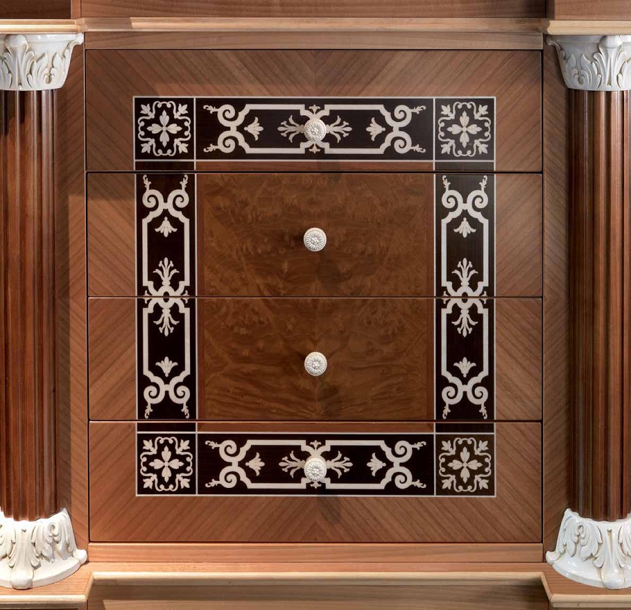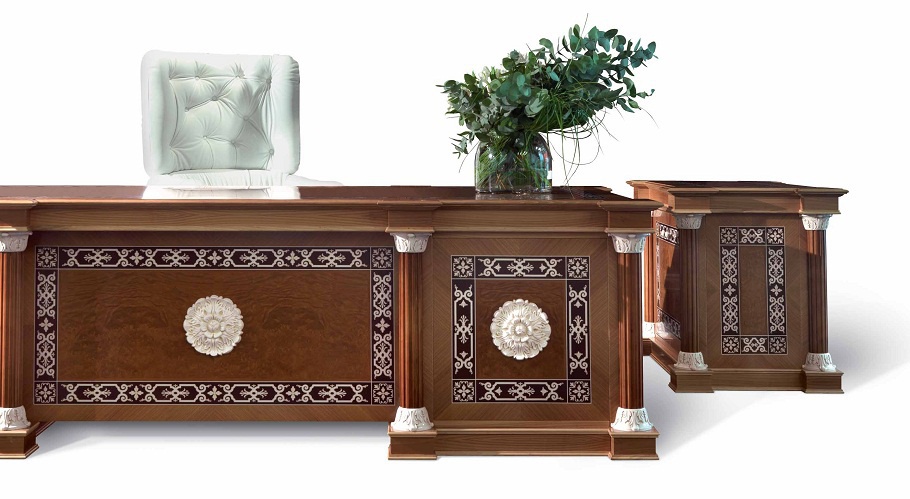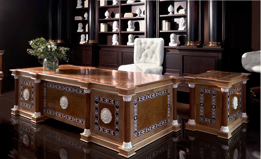 Desk with side drawers and console Magister from the Italian manufacturer Elledue. Table top, legs made from solid Hickory wood, lacquered, also in the side is a chest of drawers. Decorations are a painting and modeling. Colors - in stock. A great choice for the office in classic style. The table can be supplemented by a prefix, which will increase the working area.