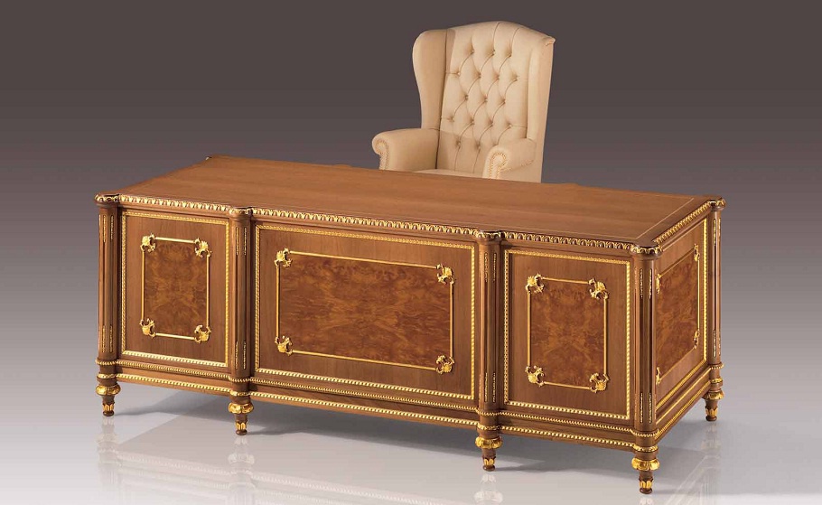 Desk Maria Antonietta from the Italian manufacturer Elledue. Table top, legs made from solid Italian walnut, lacquered. Model with side drawers. Element of the decor is carving covered with gold leaf. Colours/varnishing/sizes are back in stock. A great choice for the office in classic style.