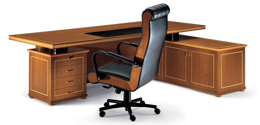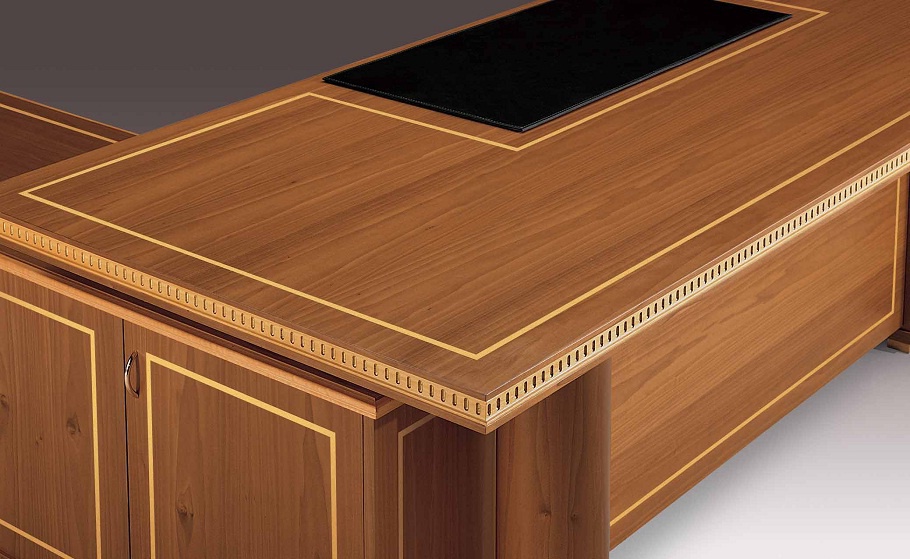 Desk Namur from the Italian manufacturer Elledue. The table top, the legs are made from solid wood, lacquered, in the lateral part of the chest is located, as well as an additional section, which increases the useful working area. Part of the main countertop is a coating of natural leather. D?cor is uncluttered thread around the perimeter of the table top, covered with gold leaf and gilded fittings. Colors/veneer/lacquering/ - according to the catalogue of the manufacturer. A great choice for the office in classic style. The table can be supplemented with a wardrobe and a window from the same collection.