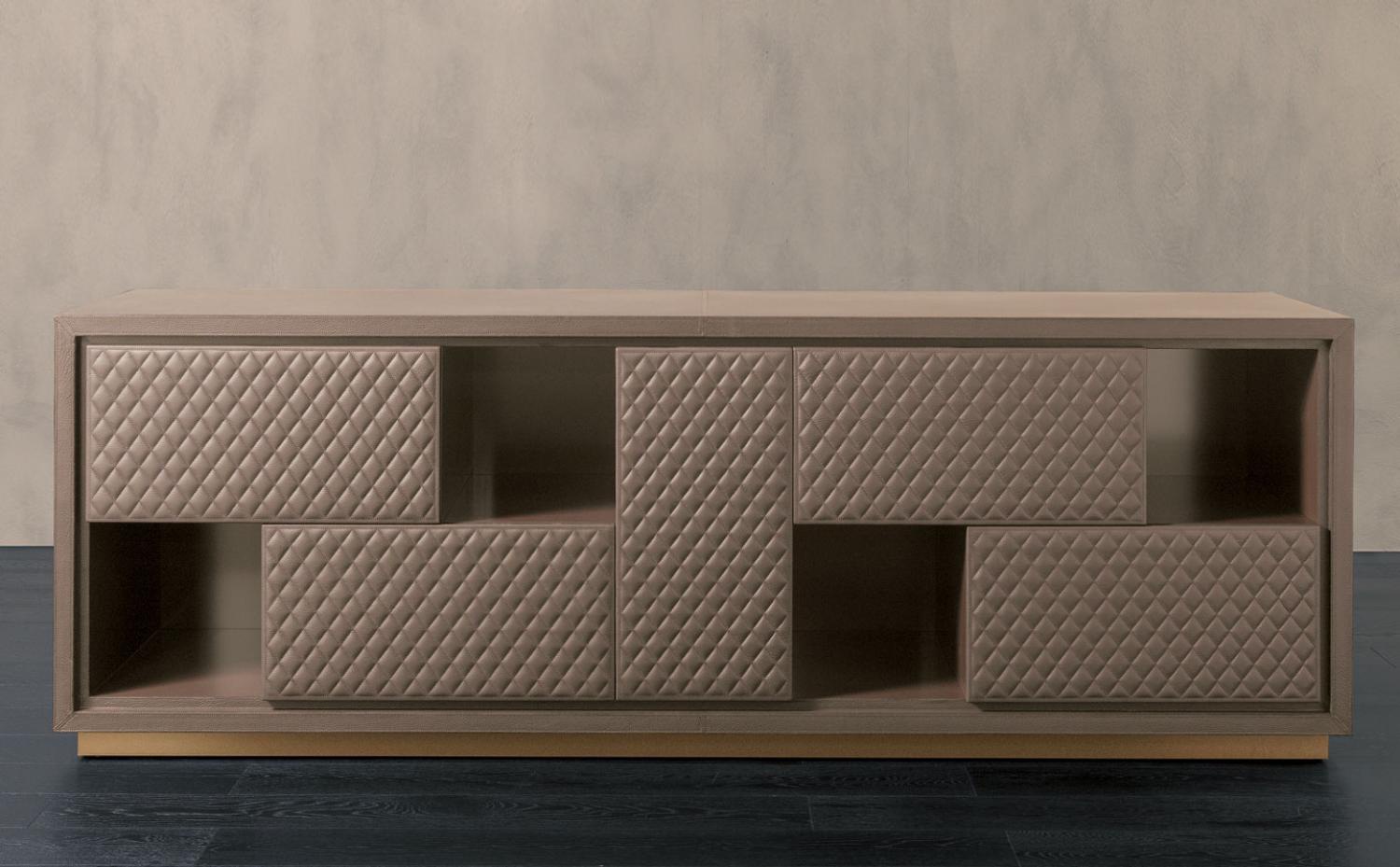 London Orizzontale a chest of drawers from Italian manufacturer Rugiano. The frame is made of wood. Locker consists of drawers in leather and open modules in the finishing of steel or bronze. Color catalog factory. The model will surely embellish your interior.