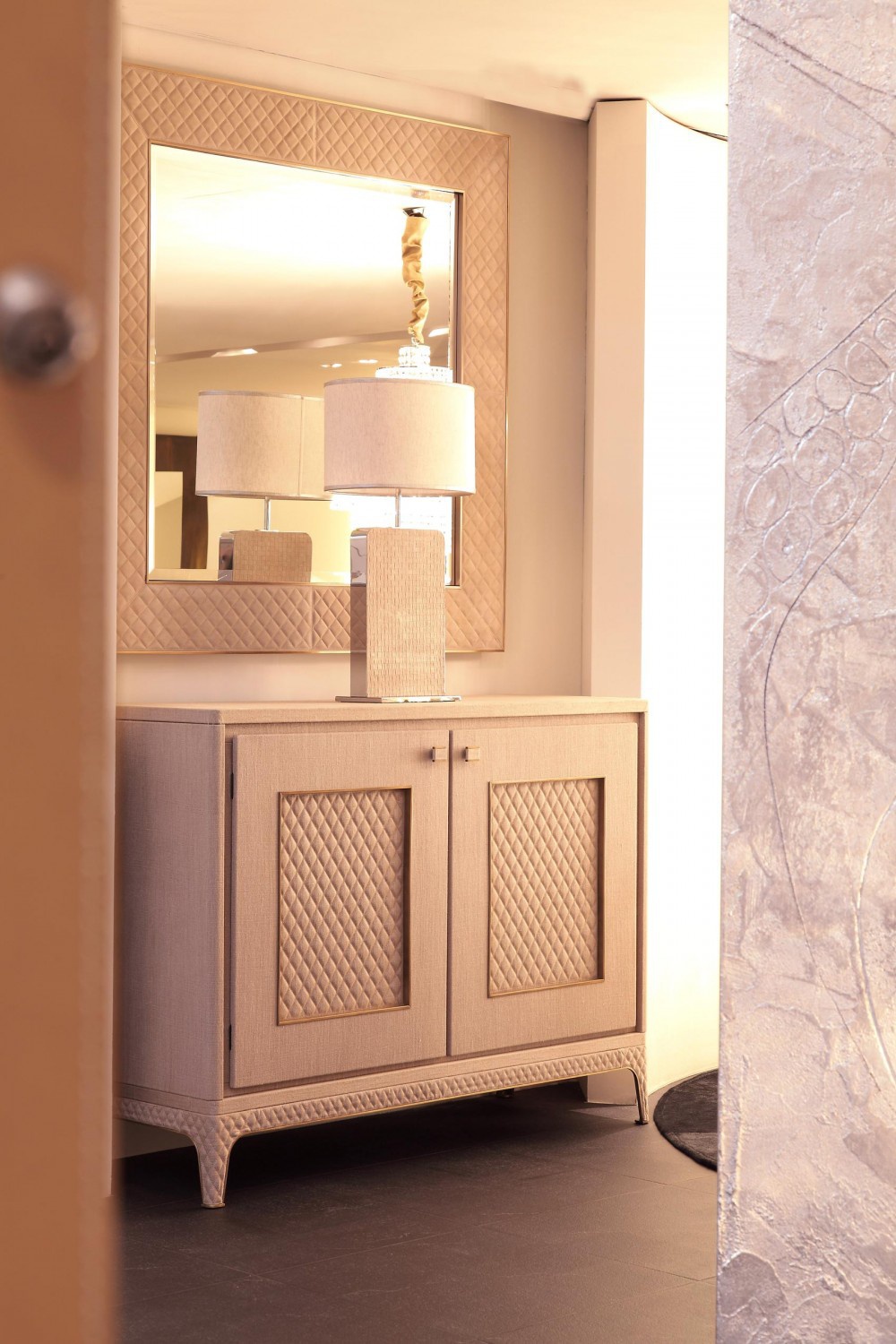 A chest of drawers with hinged doors Desire from the Italian manufacturer Rugiano. Presents a model with 2 swing doors. The frame is made of wood, doors upholstered in leather. Legs and door decorated with bronze or steel. Colors to choose from for the company directory. Inside a chest of drawers with shelves and drawer. Optionally available LED backlighting. A great, functional option for your living room in modern style with elements of glamour and art Deco.