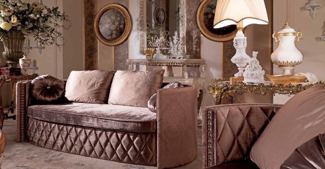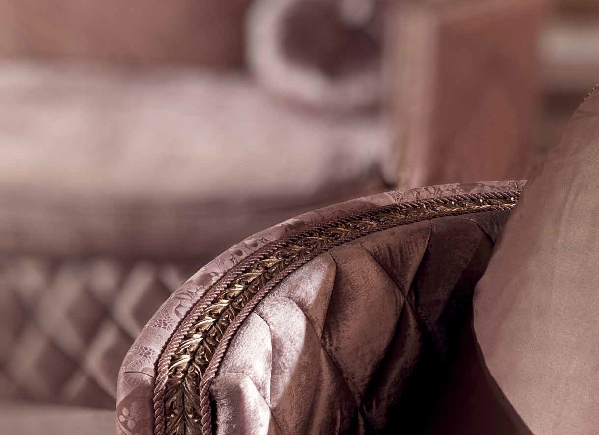 A double sofa from Italian manufacturer Jumbo Collection, Canova collection. Model in the classic style. The frame is made of natural wood, upholstery - textiles from the company portfolio. Colours in stock.