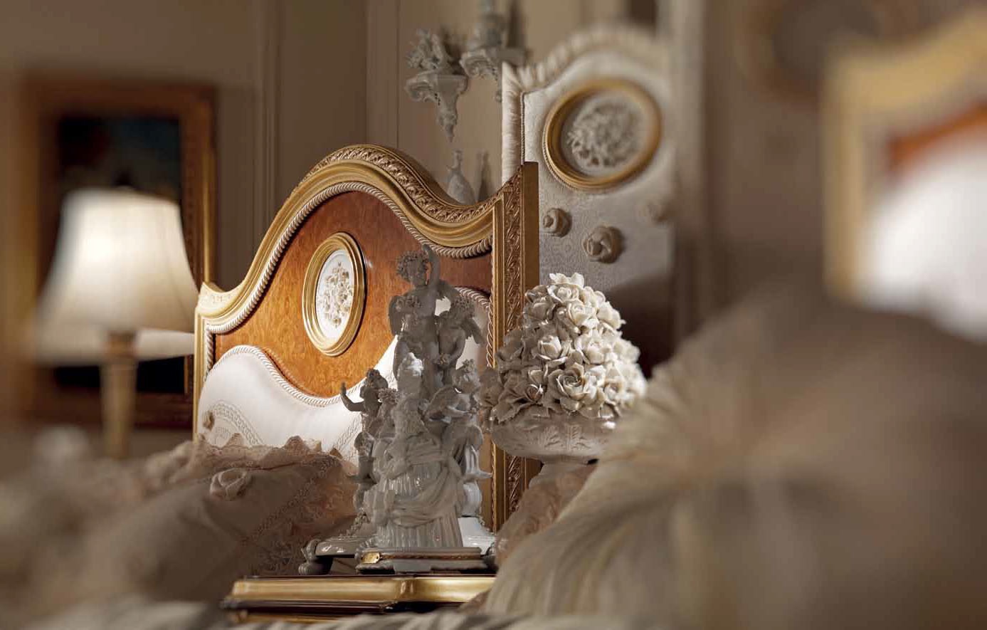 Single bed with upholstered headboard from the Italian manufacturer Jumbo Collection, Canova collection. Model in the classic style. The frame is made of wood, decorative elements, handmade in gold plated finish. Upholstery - textiles from the company portfolio. Colours in stock.