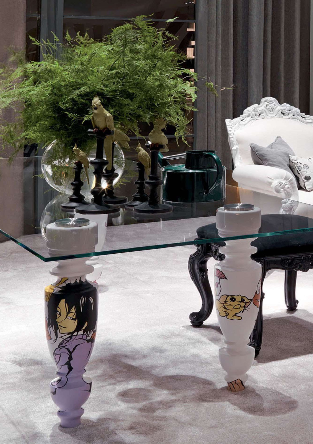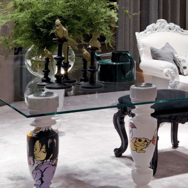 Table Fairy Tales from the Italian manufacturer Moda. Table with glass top on high legs made of solid wood. Tempered glass, transparent. Carved legs, lacquered in white and decorated with colored paintings in the style of pop art. The style of furniture is perfect for a nursery or a teen room.
