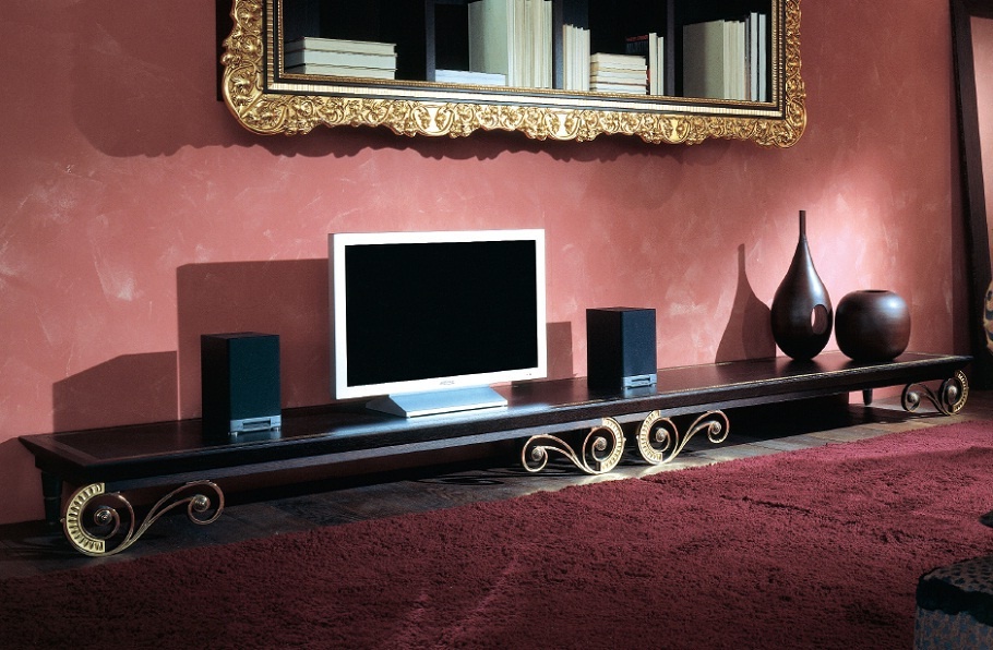 Stand Rokko Elledue production. Top is made of solid wood, legs - metal, wrought iron, painted/ color - from the company portfolio. The model is presented in 2 versions, the difference in size. The product can serve as a stand for TV and other media devices, as well as the bench. Will perfectly complement a living room