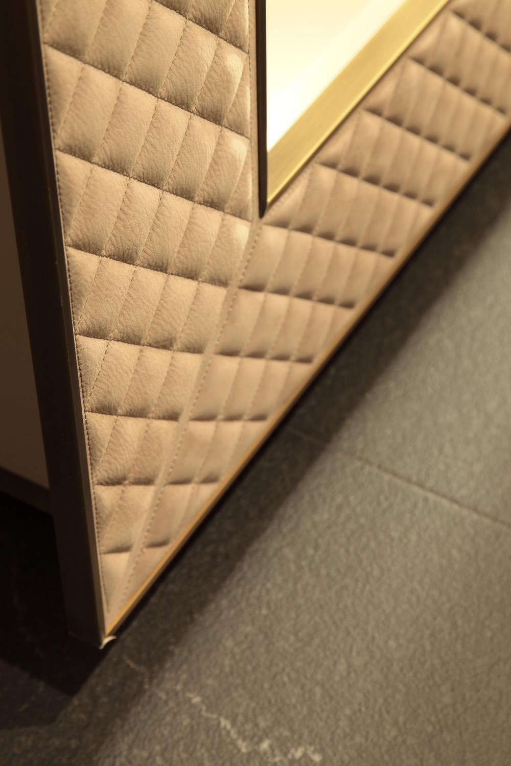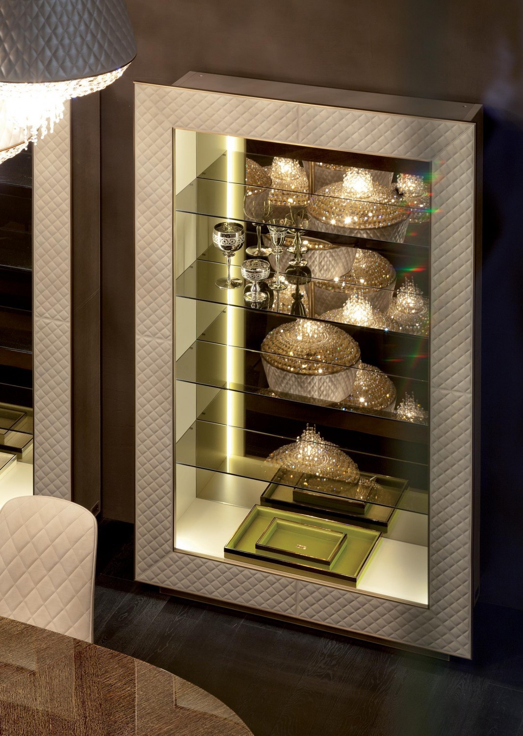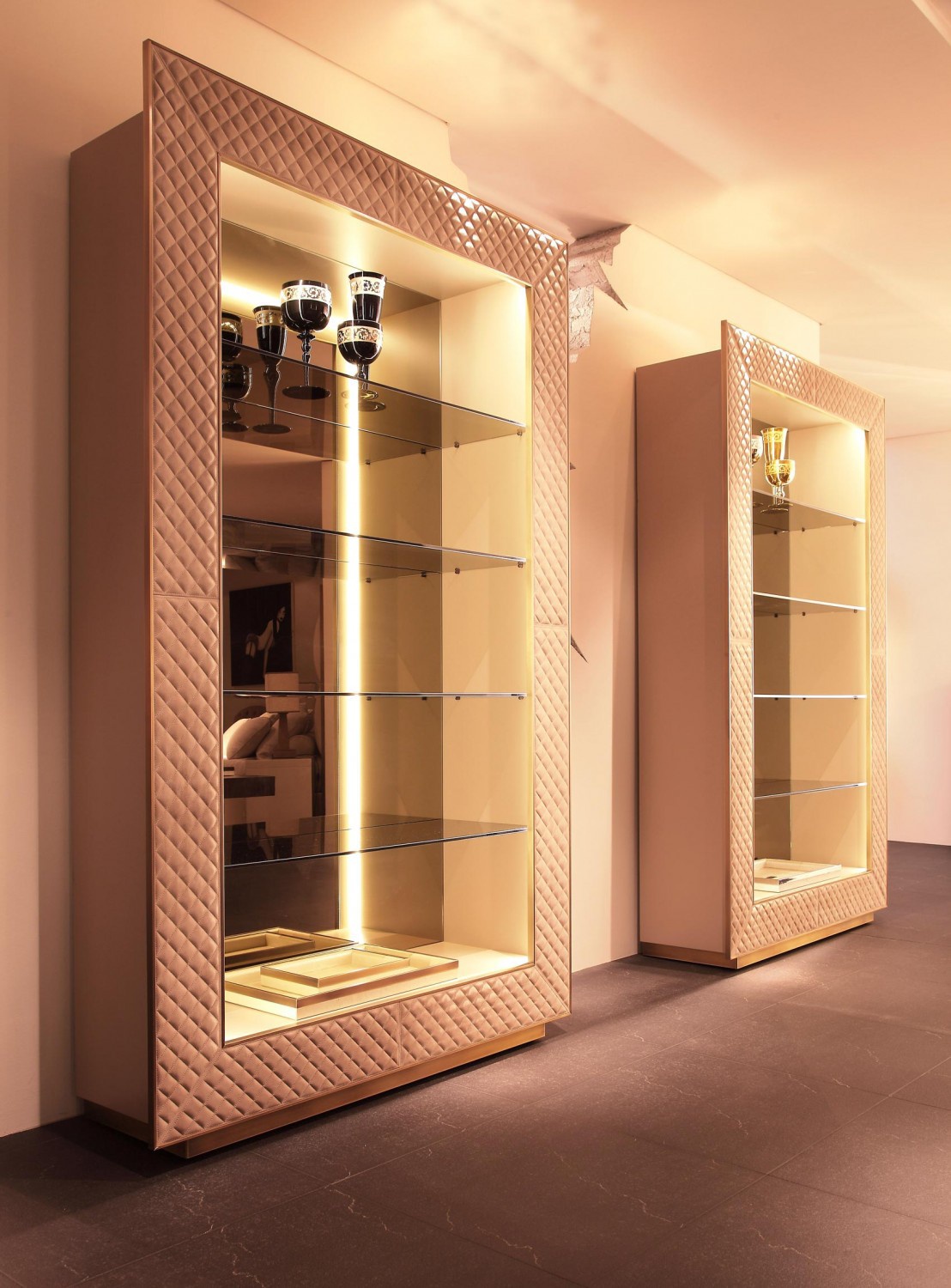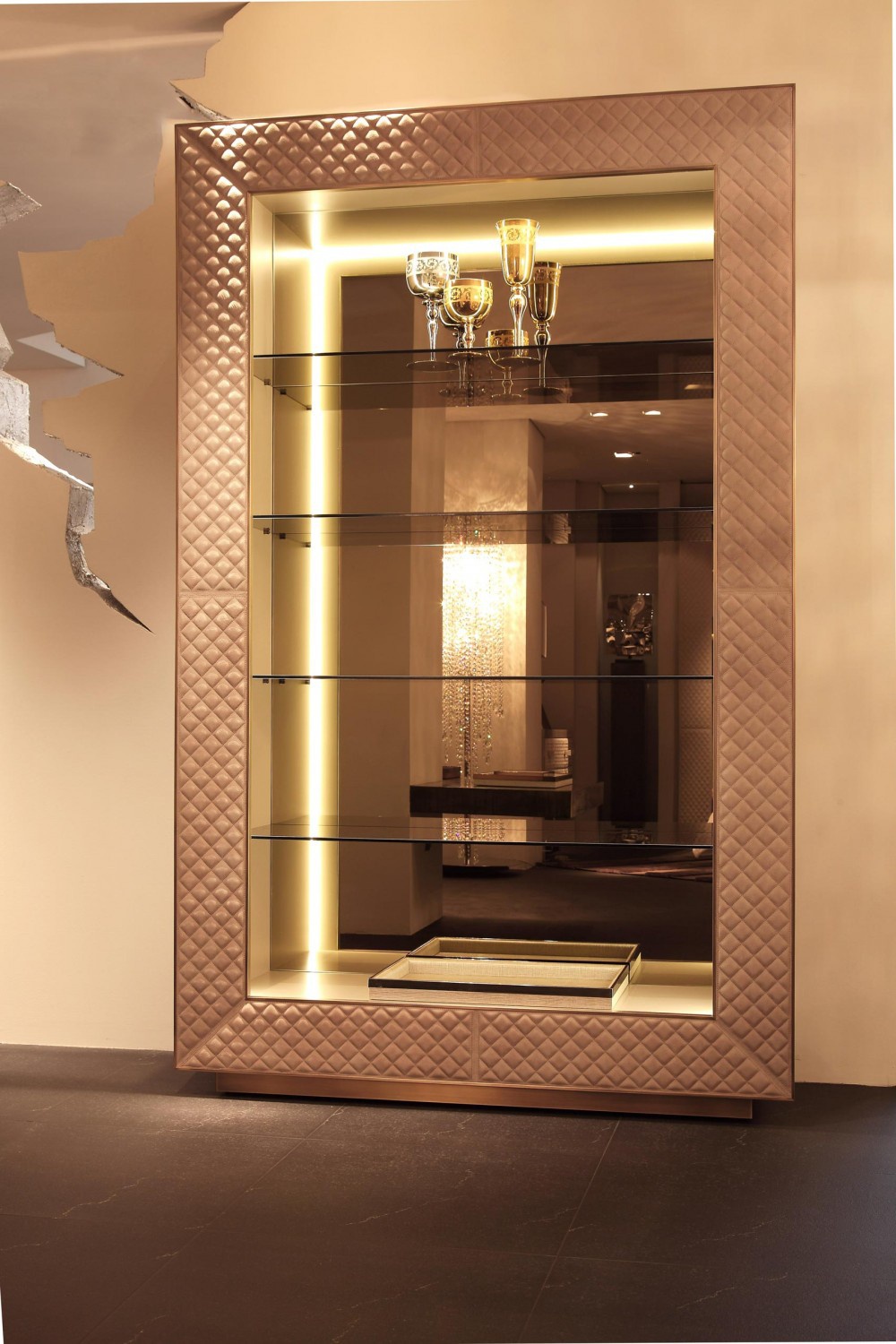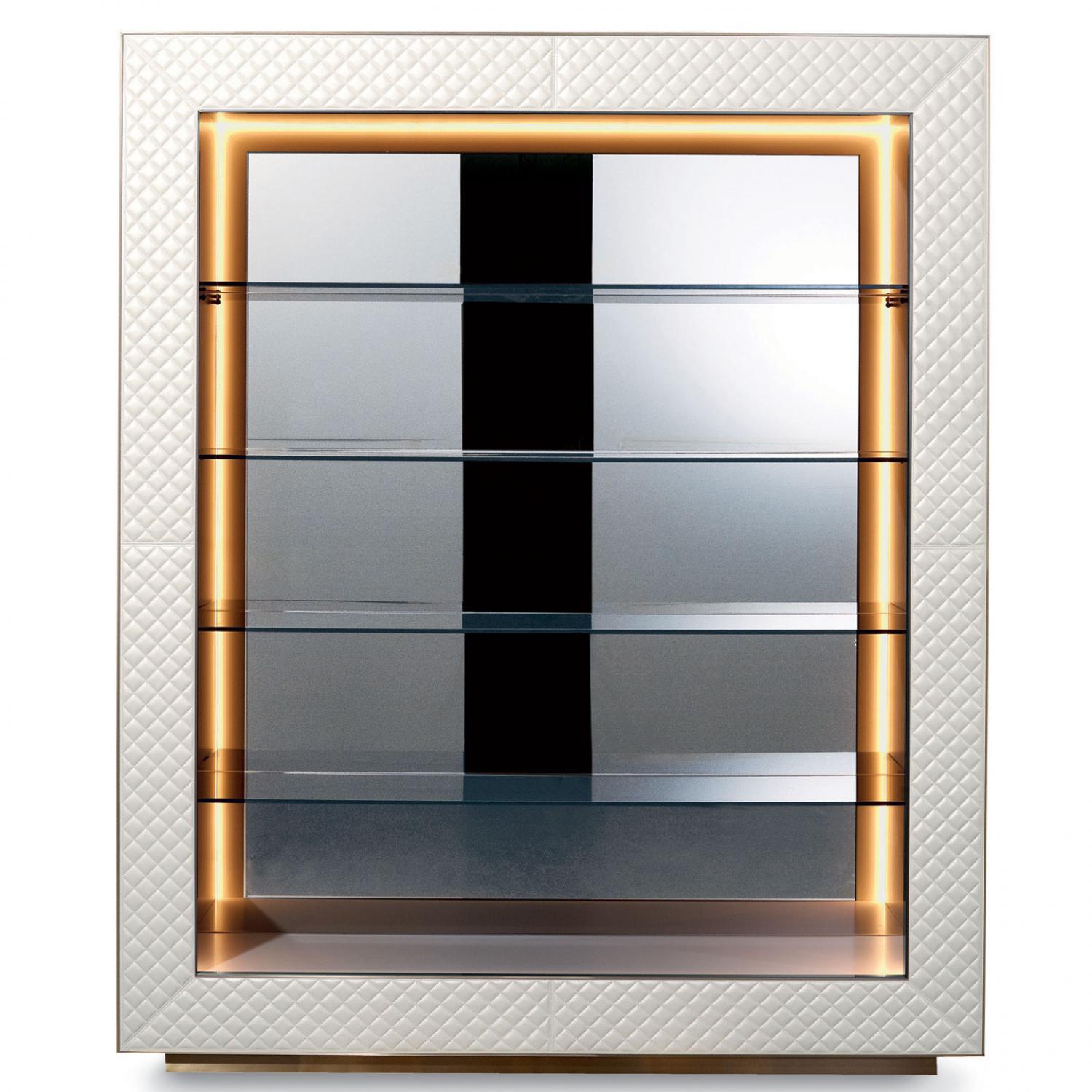 frame: wood shelves: glass finish: genuine leather rear panel: mirror glass |