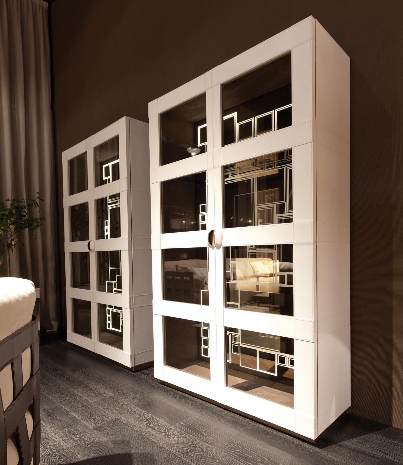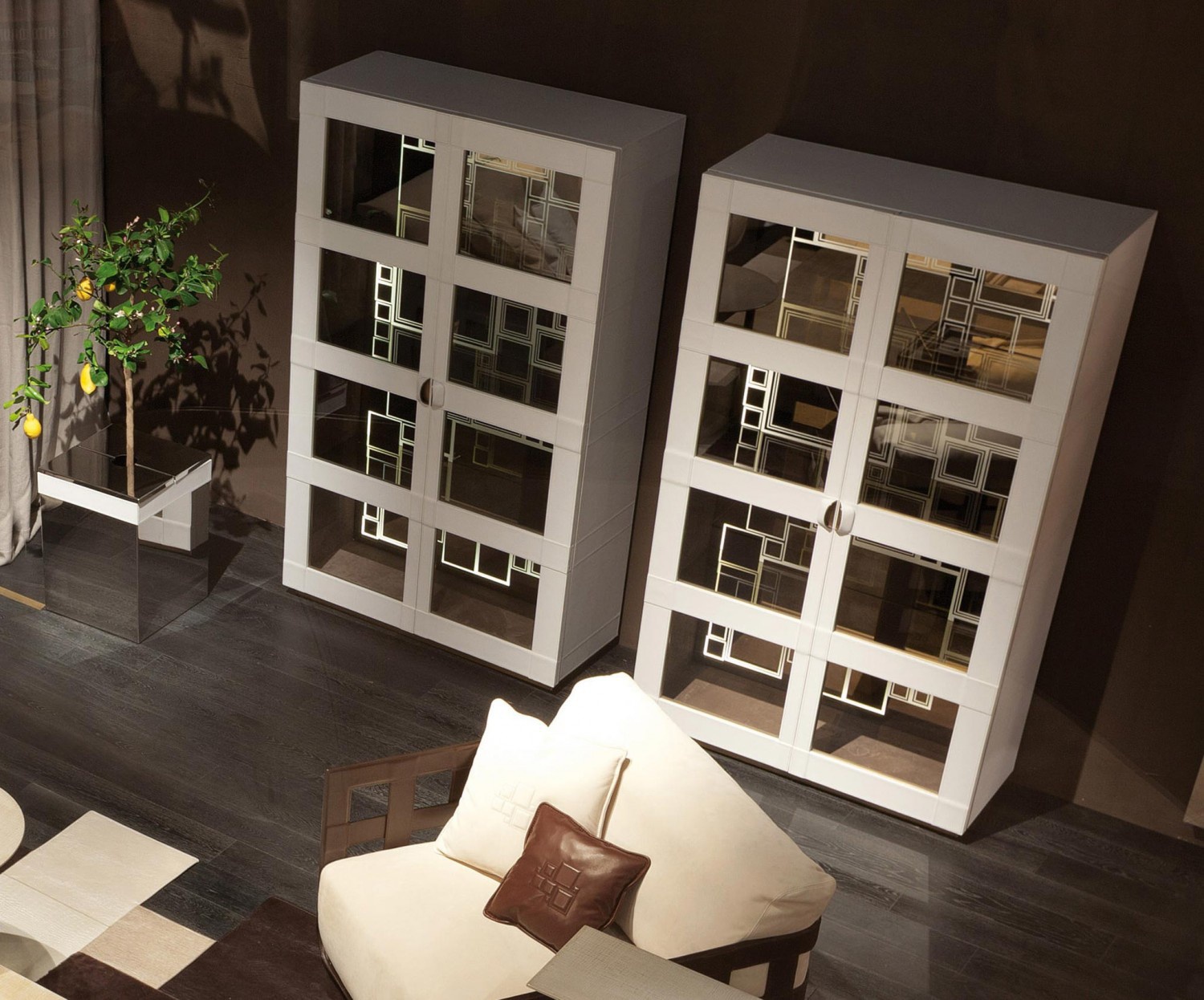 Showcase Braid from the Italian manufacturer Rugiano. The model with two hinged doors. The frame is made of wood, base metal, doors glass, leather upholstery. Color to be selected from the manufacturer's catalogue. Inside the window is equipped with a rear mirrored panel with abstract geometric shapes. Optional factory offers LED illumination. Great for living room or dining room in modern style with elements of glamour and art Deco.