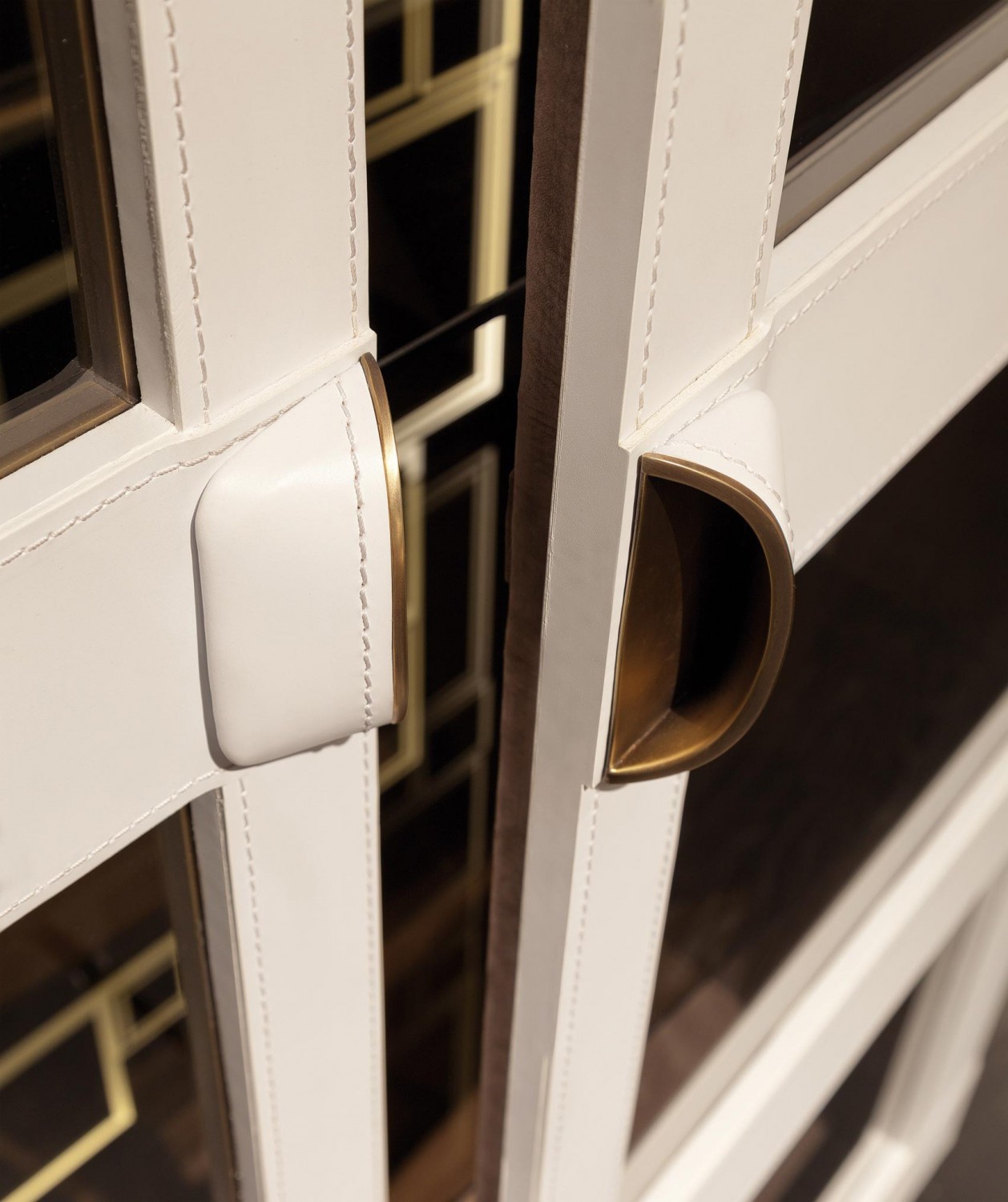frame: wood sash: tempered glass handles: metal finish: genuine leather |