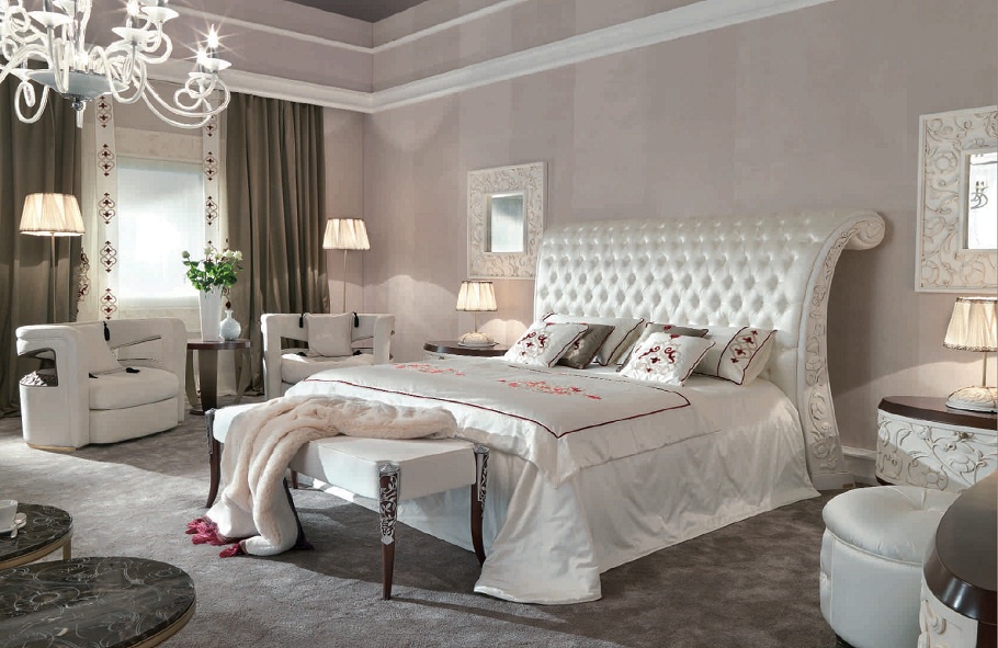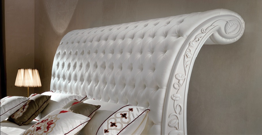 Bed from Saraya Elledue Italian manufacturer. The frame is made from solid wood, upholstery headboard - textiles from the company portfolio. Color - white. Model double bed with high upholstered headboard. Finish padded headboard with carved wooden frame. A charming choice for the bedroom. Bed included in bedroom set from the same collection.