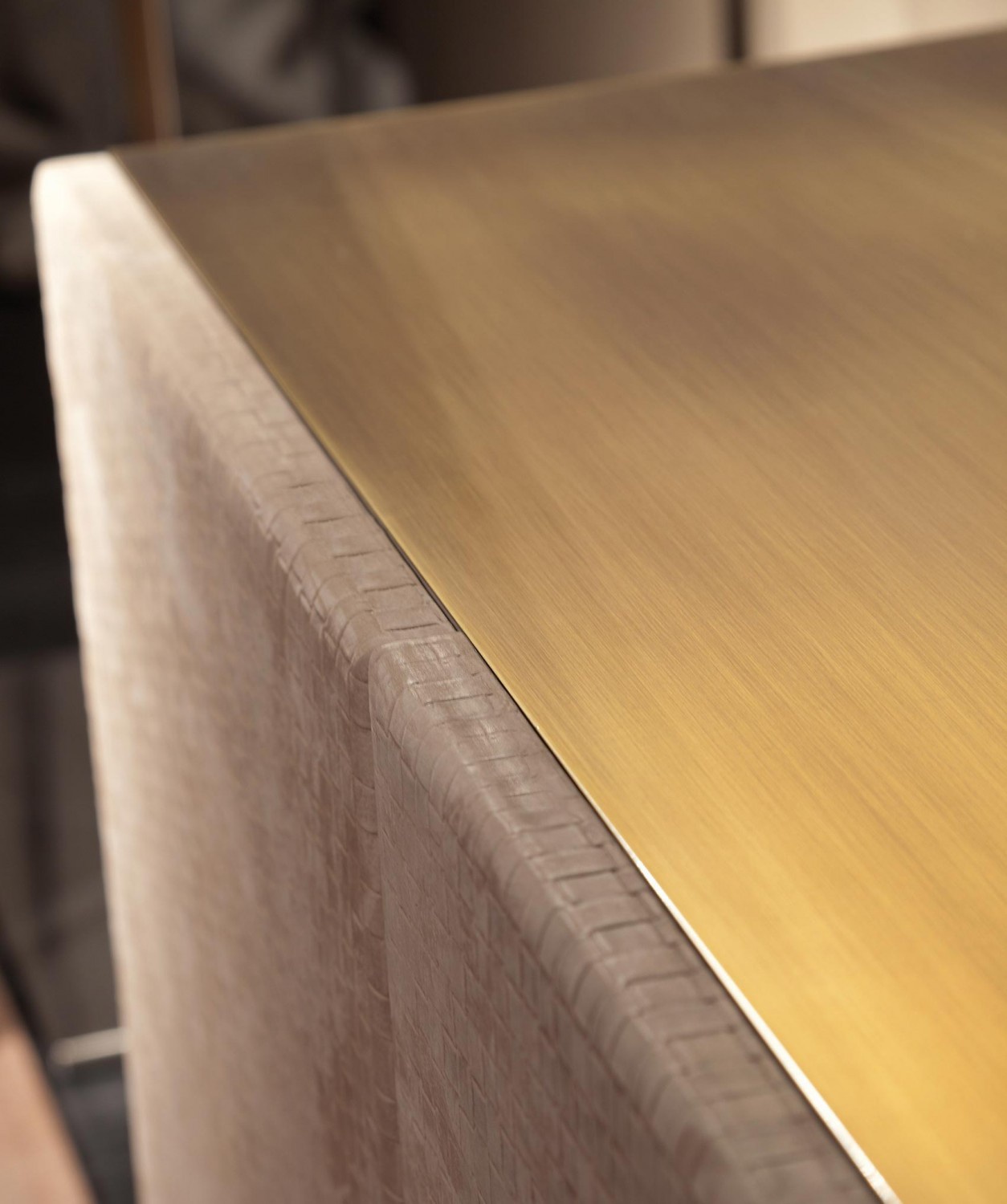 Cabinet with hinged doors Sidney from the Italian manufacturer Rugiano. The presented model cabinets for TV with 6 swing doors. The frame is made of wood, doors upholstered in leather, table top, base and side panels in the decoration of bronze or steel. Inner matte lacquer finish. Colors to choose from for the company directory. For your convenience, the factory offers 3 sizes of tables. A great, functional option for your living room in modern style with elements of glamour and art Deco.