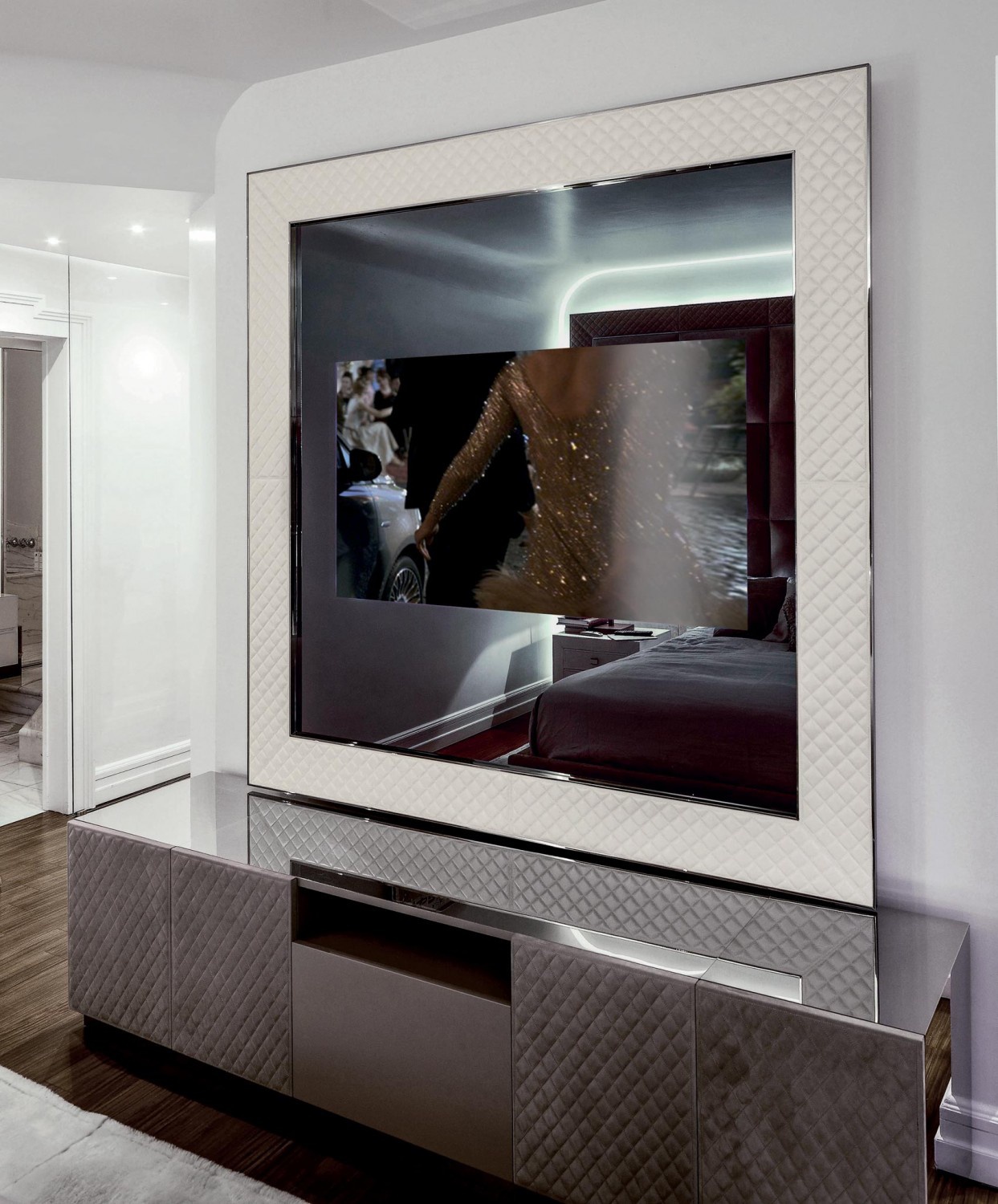 Nightstand with open shelf Boston from the Italian manufacturer Rugiano. The presented model cabinets for TV with 4 hinged doors and drawer. The frame is made of wood, doors upholstered in leather, table top, base and side panels in the decoration of bronze or steel. Central drawer in gloss lacquer or leather. Inner matte lacquer finish. Colors to choose from for the company directory. For your convenience, the factory offers 3 sizes of tables. A great, functional option for your living room in modern style with elements of glamour and art Deco.