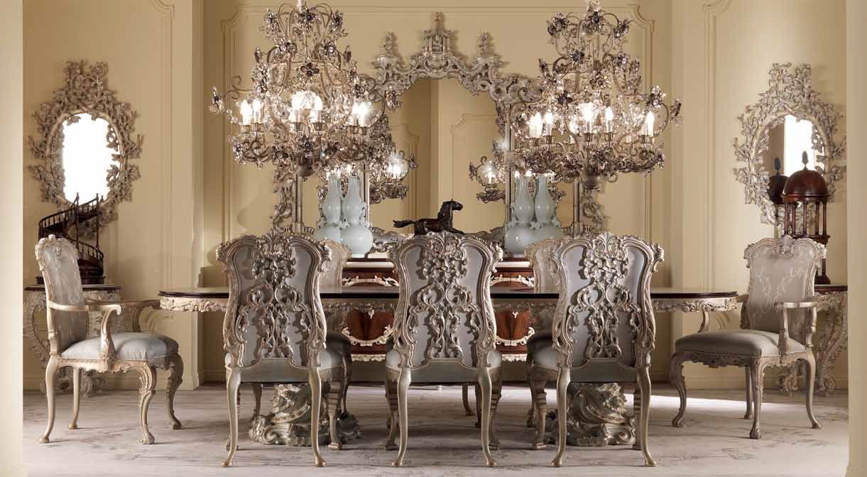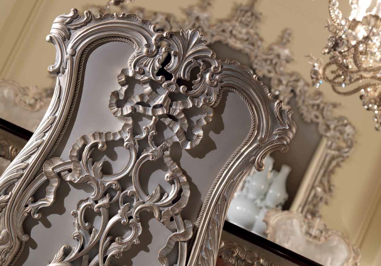 Set for the dining room from Italian manufacturer Jumbo Collection. Furniture from the Regency collection, made in classic style. Frame made of natural wood, decorated with carving handmade in silver plated and gold plated finish. Upholstery - textiles from the company portfolio. Colours in stock.