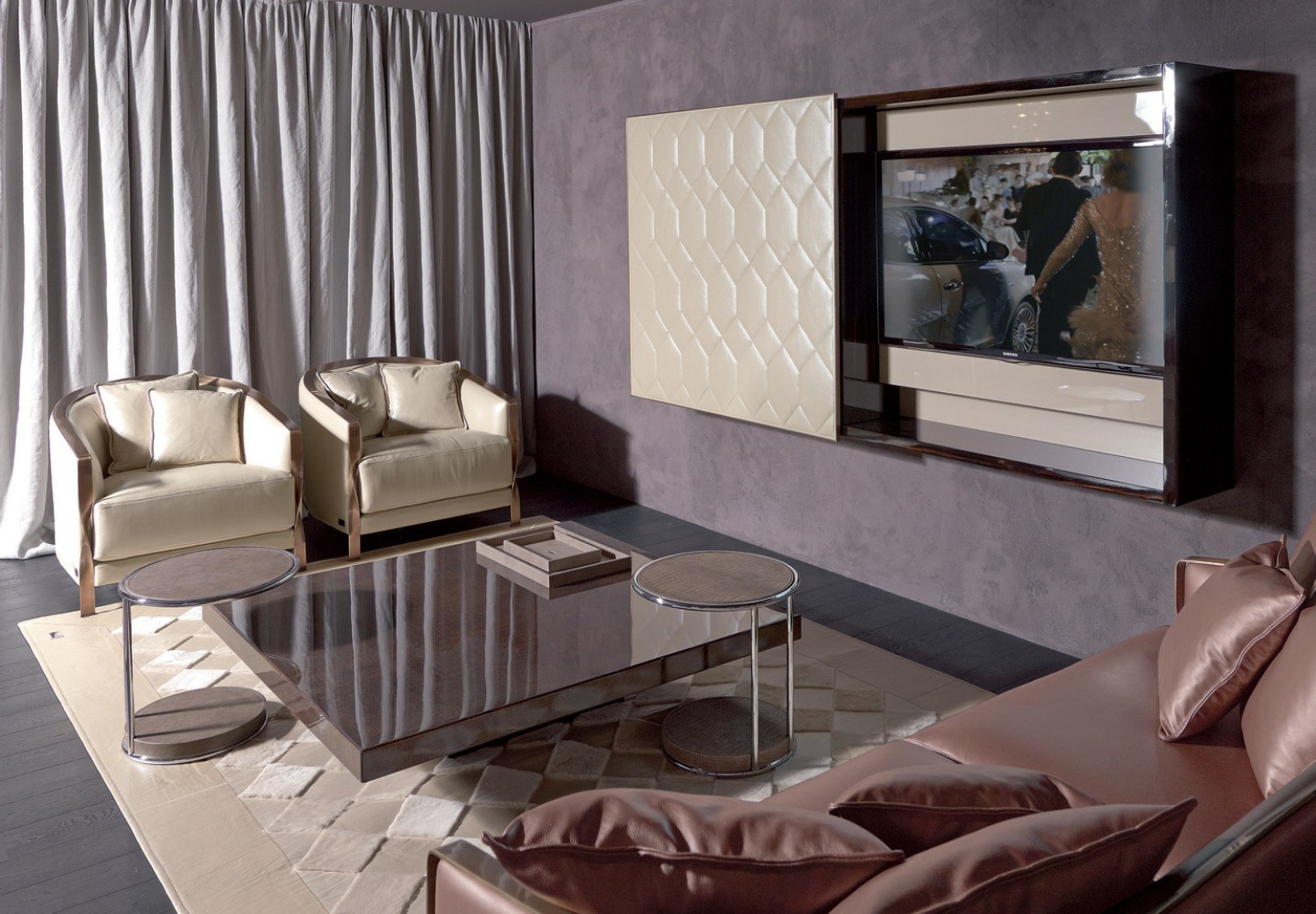 Furniture for TV Tatin from the Italian manufacturer Rugiano. Presents a model with sliding door. With one hand inside, there are open shelves with LED illumination, and place for TV. The wooden frame made of ebony wood in a glossy lacquer. The front panel is wrapped in leather, in a frame of bronze. Colors to choose from for the company directory. A great, functional option for your living room in modern style with elements of glamor.