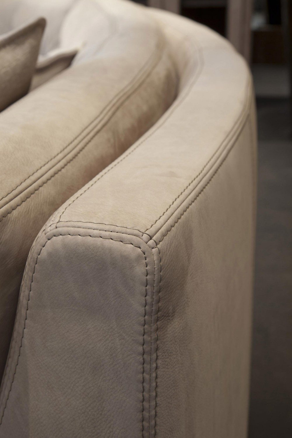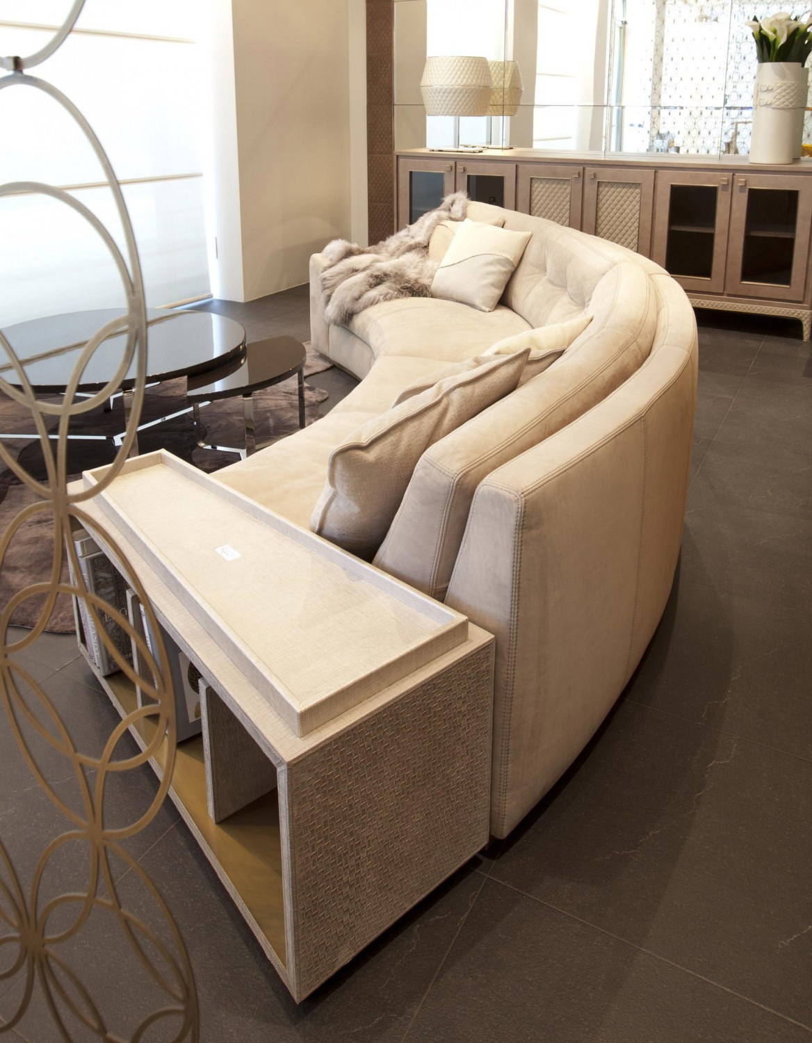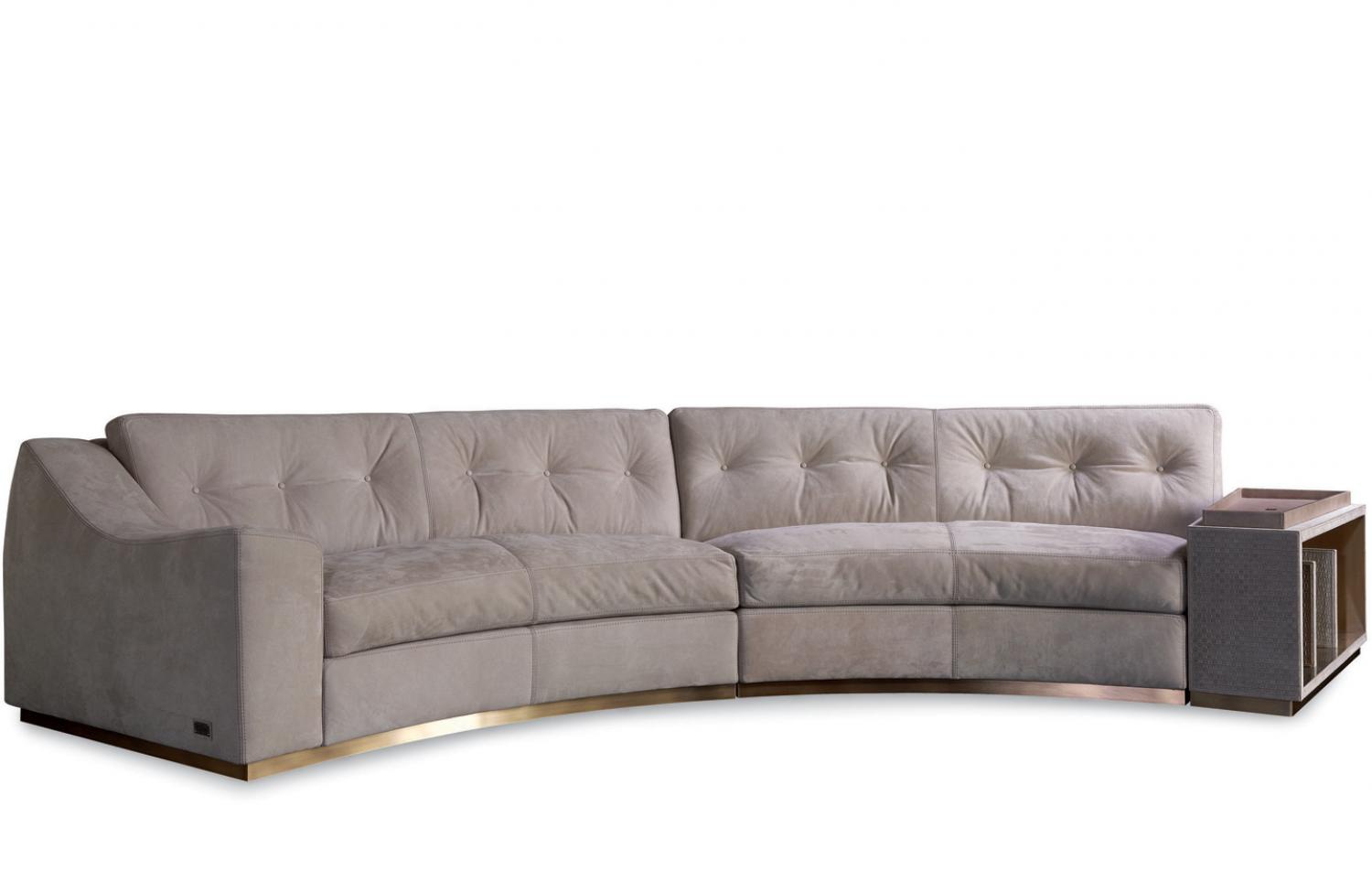 Semi-circular sofa Golden Circus from the Italian manufacturer Rugiano. The frame is made of wood, filler - polyurethane foam of varying stiffness. Upholstery textiles or leather colours to choose from a catalog company. The base is made of steel or bronze. The factory offers a combined version of the armrest with one hand and the bookcase, finished glossy lacquer and leather on the other side. The set includes the pillows. Model original semicircular shape, will decorate the interior of Your living room in modern style.