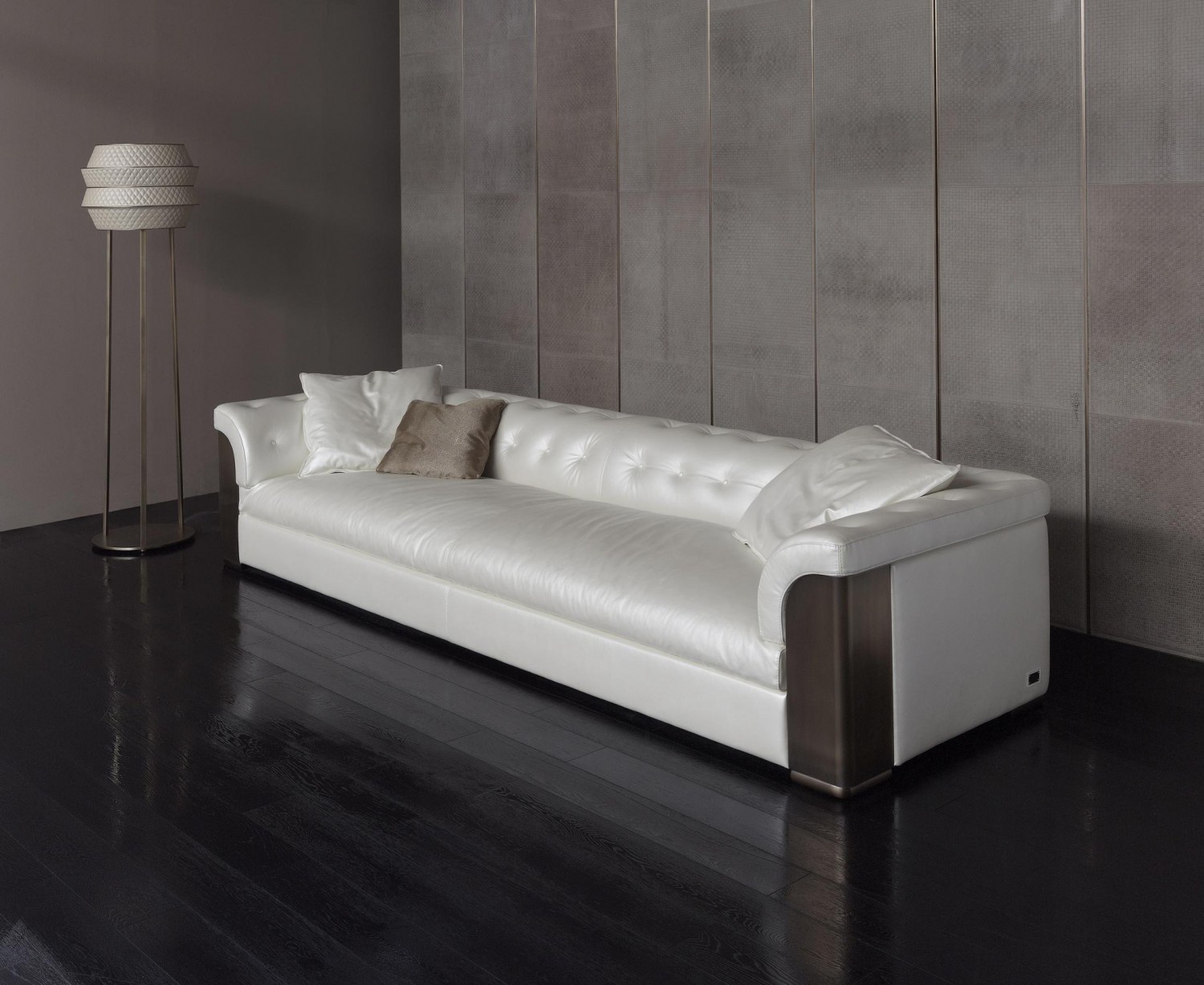 Double sofa Mytos from the Italian manufacturer Rugiano. Model with a rounded back and armrests. Legs and armrests of the sofa is made of steel or bronze, may be covered with skin. Skeleton models made of wood, filler - polyurethane foam of different hardness. Upholstery textiles or leather colours to choose from a catalog company. The backrest and armrests adorned with decorative stitch-Capito. The design complements decorative pillow. The model perfectly fit into the interior of a modern living room or office.