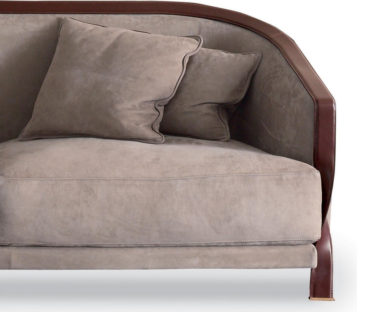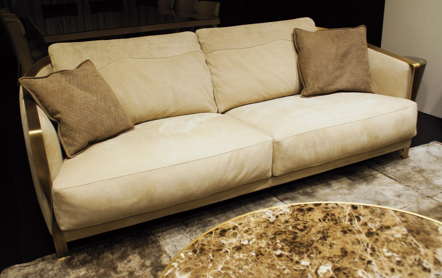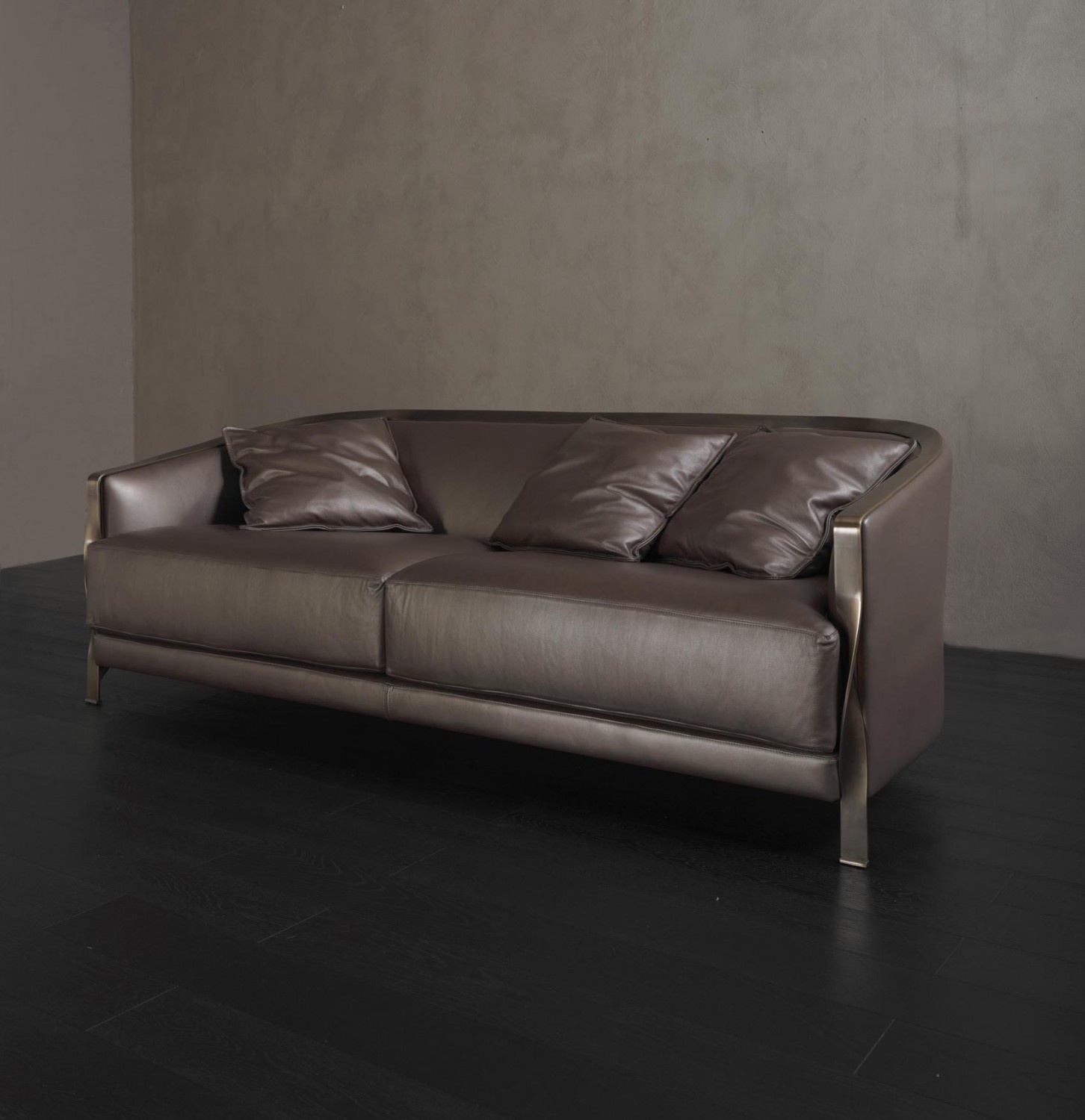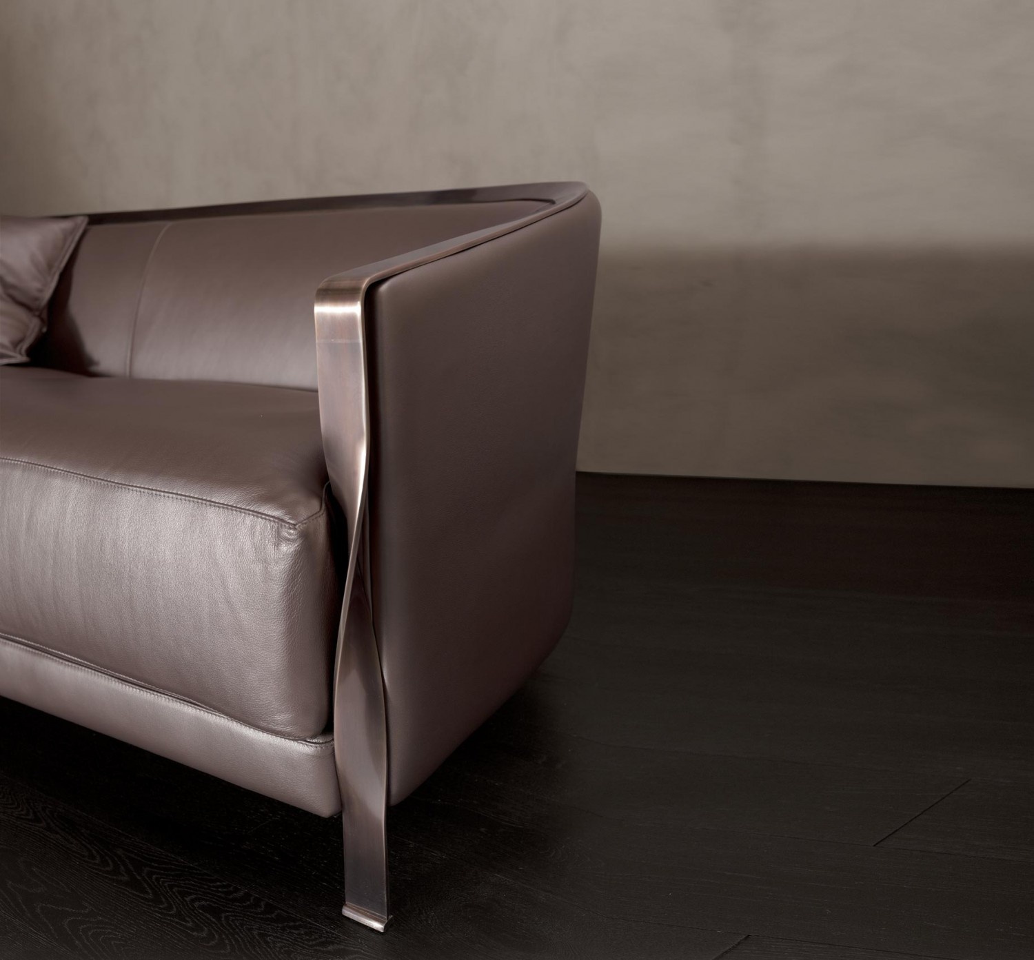 Paris two seater sofa from Italian manufacturer Rugiano. Model with a rounded backrest that becomes an armrest. The sofa legs twisted, made of bronze. Skeleton models made of wood, filler - polyurethane foam of different hardness. Upholstered in textile or leather colours to choose from a catalog company. Design complement square pads. The model will surely embellish your living room interior in modern style.