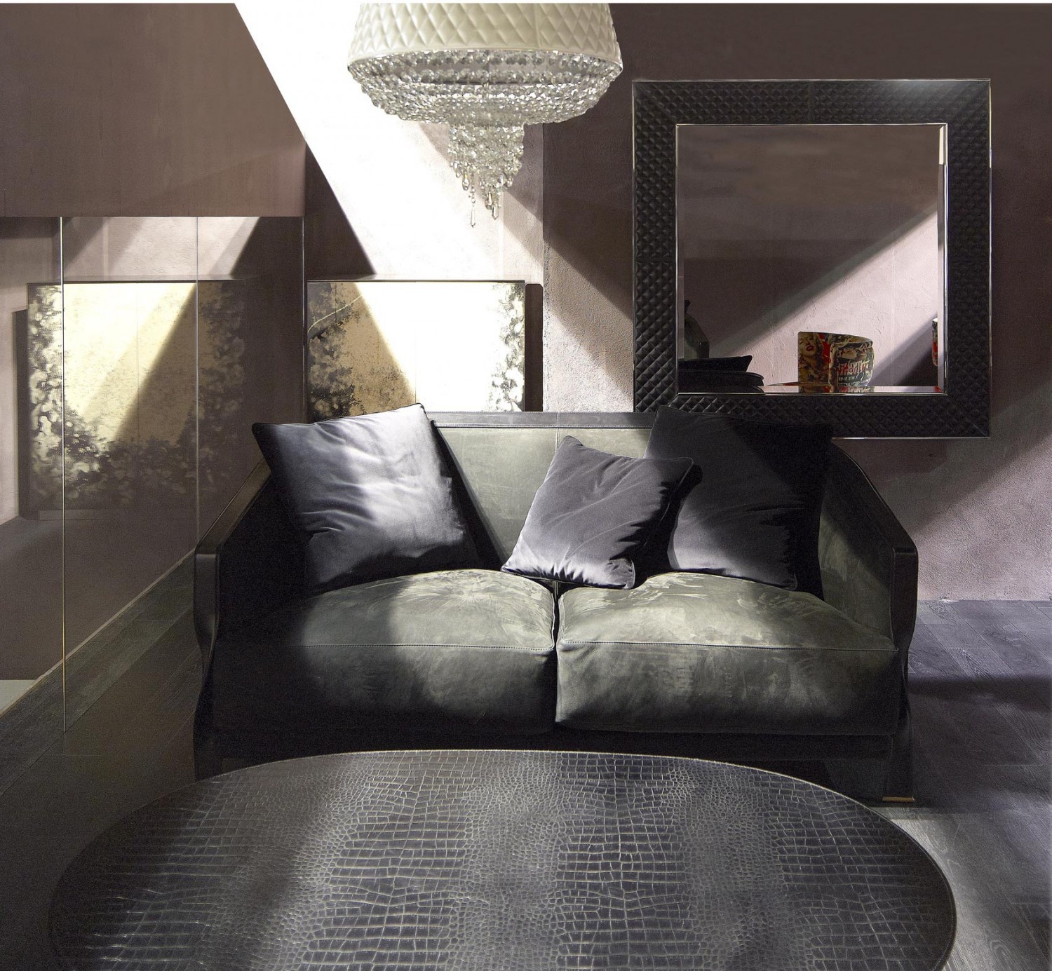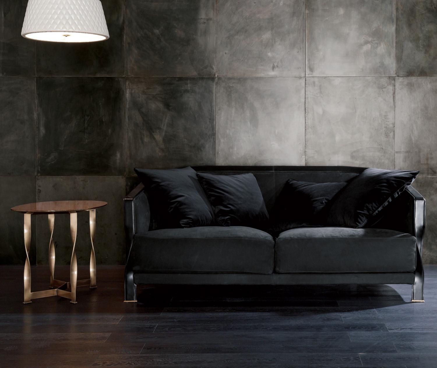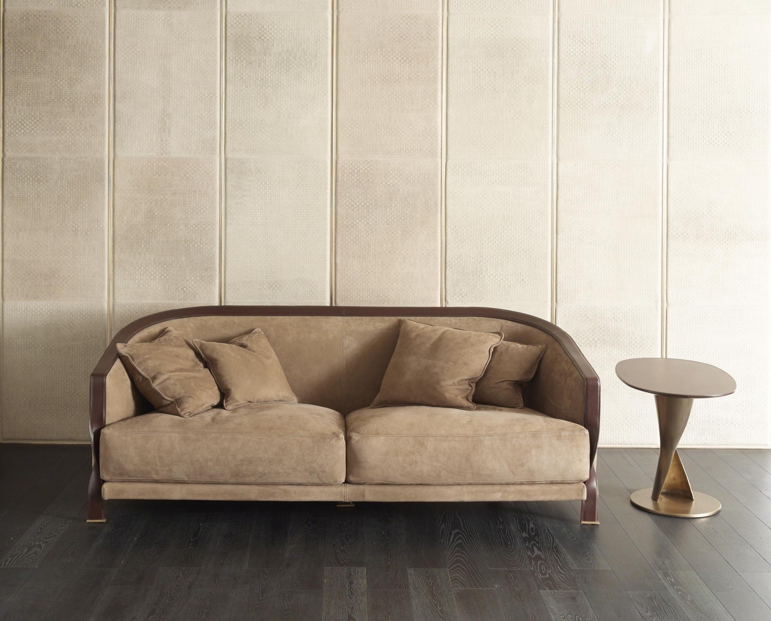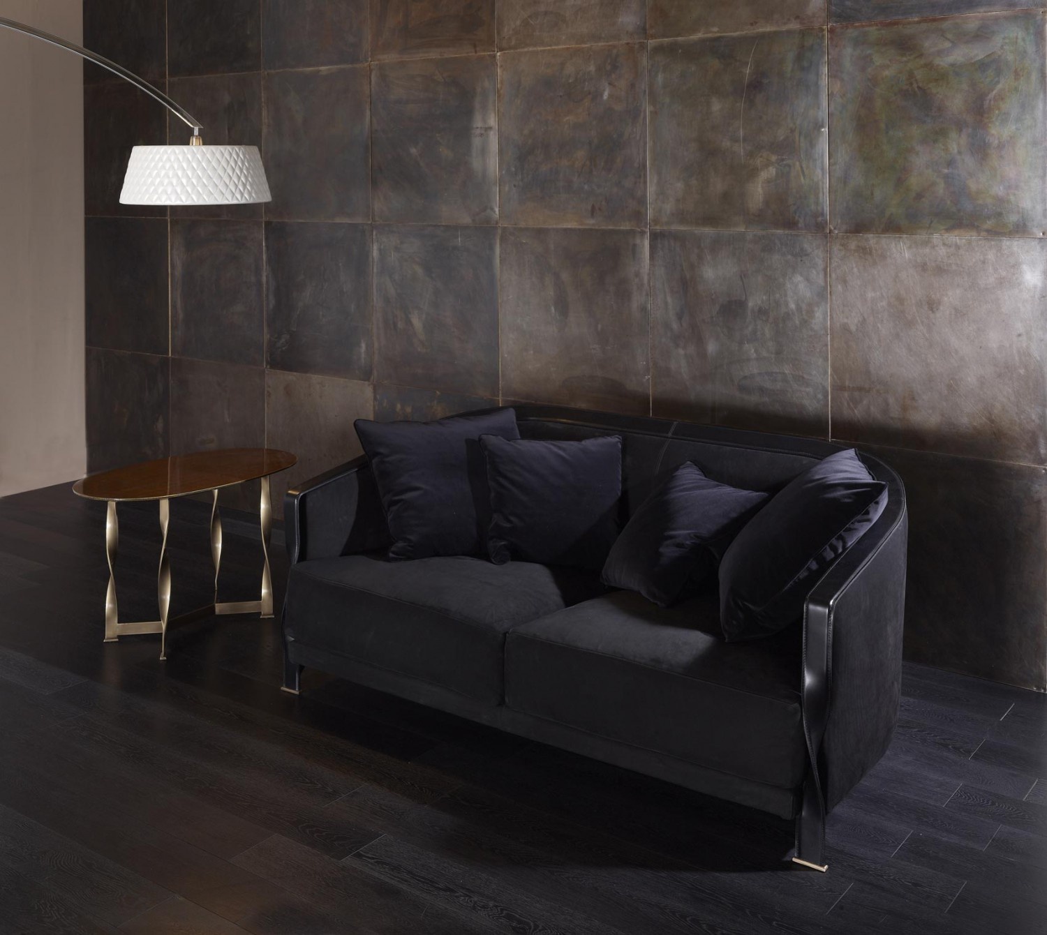 Paris two seater sofa from Italian manufacturer Rugiano. Model with a rounded backrest that becomes an armrest. The sofa legs twisted, made of bronze. Skeleton models made of wood, filler - polyurethane foam of different hardness. Upholstered in textile or leather colours to choose from a catalog company. Design complement square pads. The model will surely embellish your living room interior in modern style.