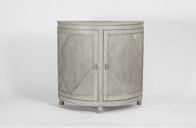 The Chelsea Demilune Cabinet from American producer Gabby. The frame is made of oak or hard wood. Hinged door and drawer style - vintage. Fittings - metal. The finish is an aged finish. The semicircular model, offers versatility and functionality.