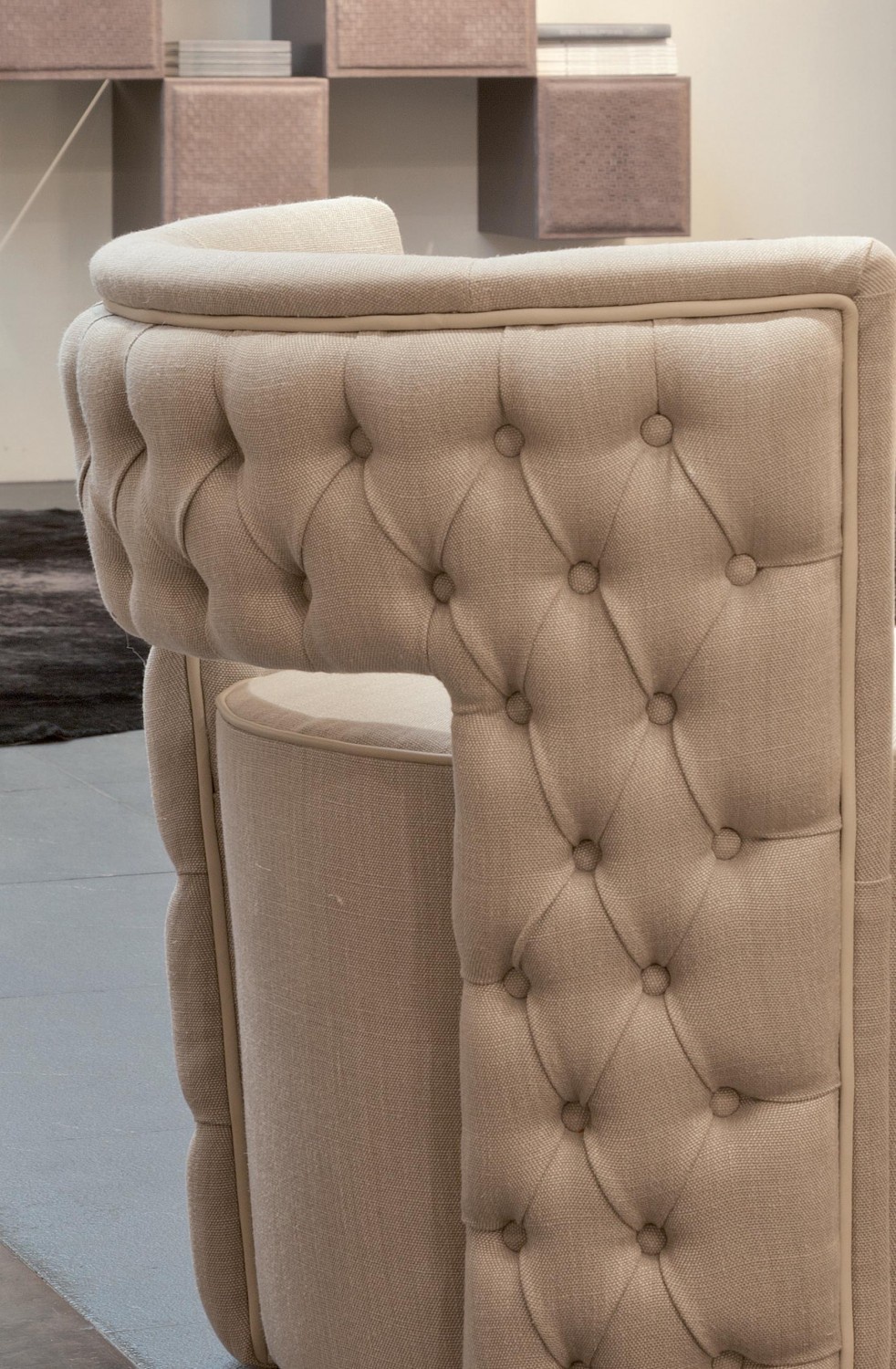 Armchair with round seat Giotto from the Italian manufacturer Rugiano. The frame is made of wood with a filling of polyurethane foam. Base finish Nickel or bronze. Upholstery of textile or leather. Colors in the catalog of the company. There are two options, with decorative stitching-Capito and smooth. A great addition to your interior.
