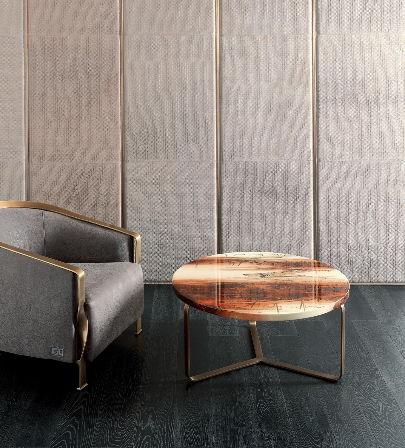 Egidio coffee table Dritto from the Italian manufacturer Rugiano. Table circular or oval shape. Table top available in leather, ebony, oak or glossy lacquer, can be decorated with a pattern. The base is made from bronze or steel. Colors to be selected from the range of the factory. For your convenience the factory has provided different sizes of tables. A modern solution for your living room interior with elements of art-d?cor and glamour.