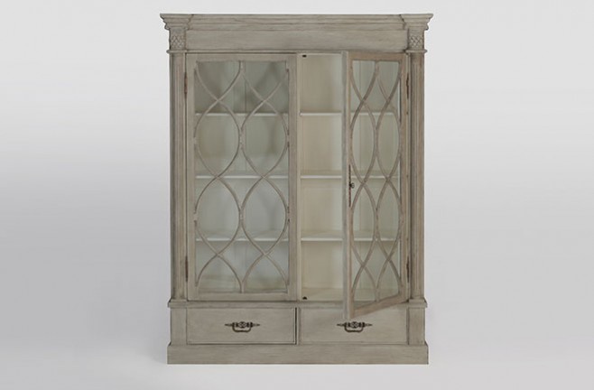 The Grace Farmhouse sideboard from the American manufacturer Gabby. The frame is made of oak or hard wood. Fittings - metal. The model with two swinging doors and drawers. Door with glass decorated with metal decorative bars. Finish aged finish - bleached oak with brashirovanie.