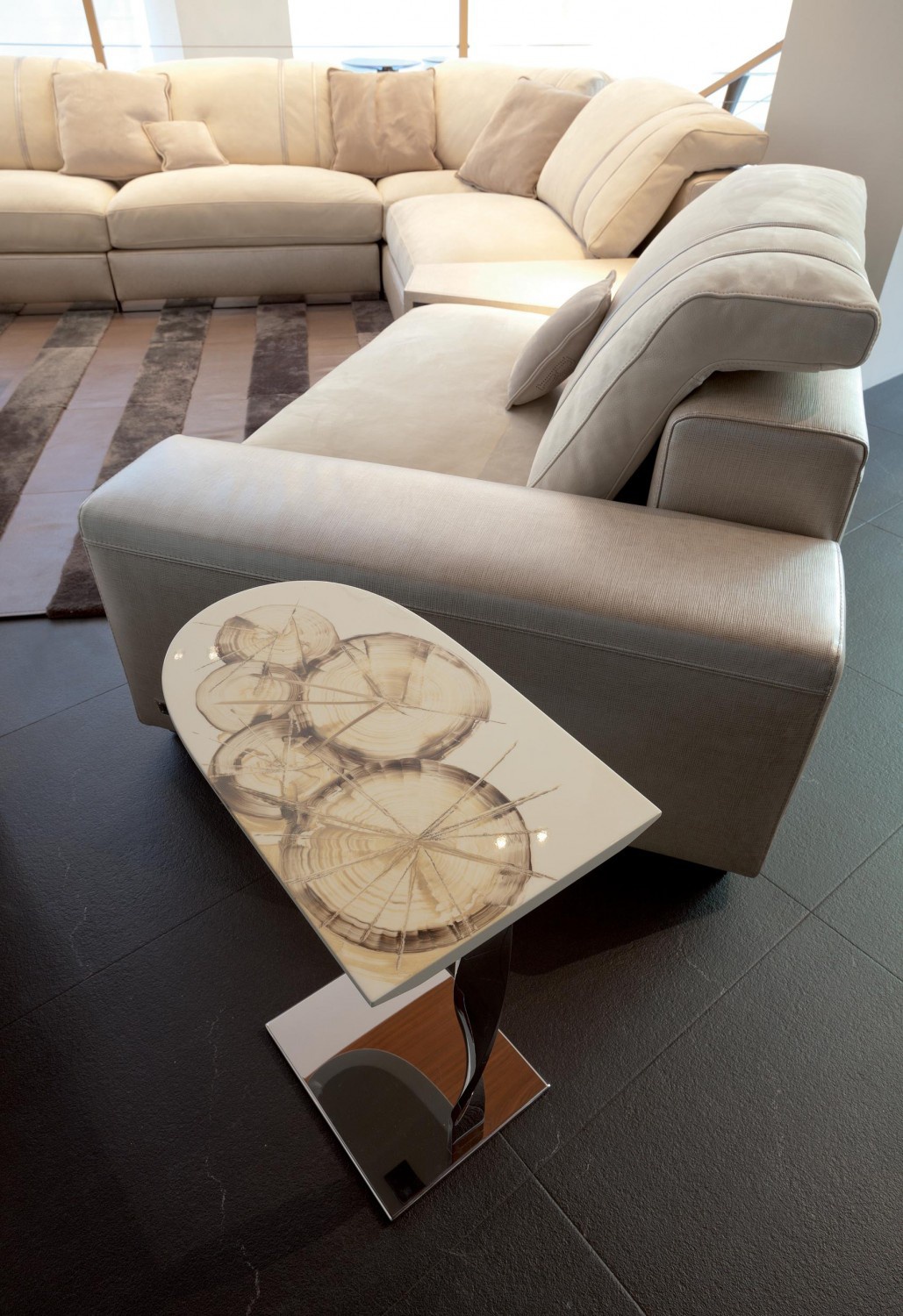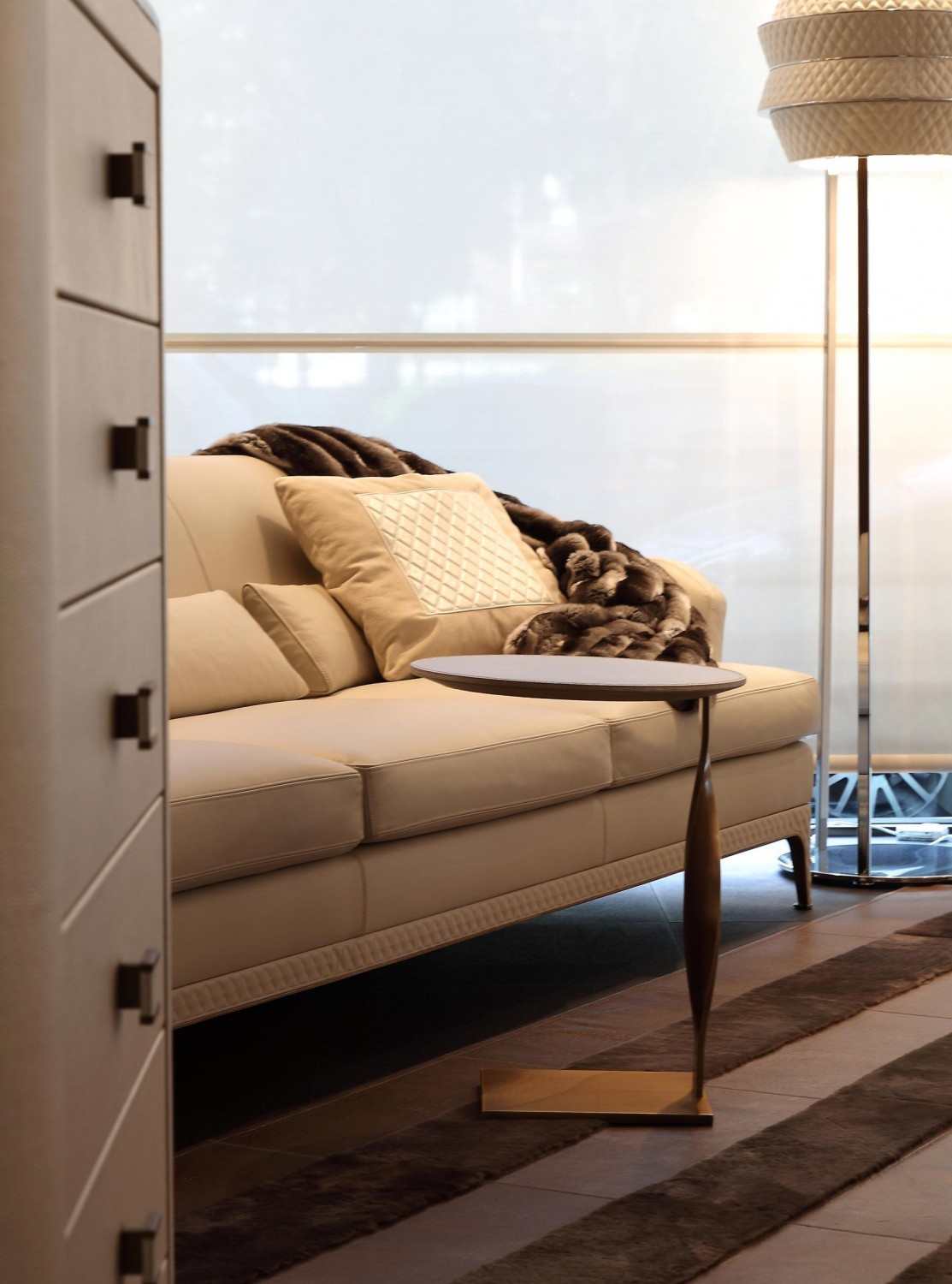 Globo coffee table from the Italian manufacturer Rugiano. Table round or rectangular. Table top available in leather, bronze and can be decorated with a pattern. The base is made of bronze or brushed steel. Colors to be selected from the range of the factory. A modern solution for your living room interior with elements of art-d?cor and glamour.