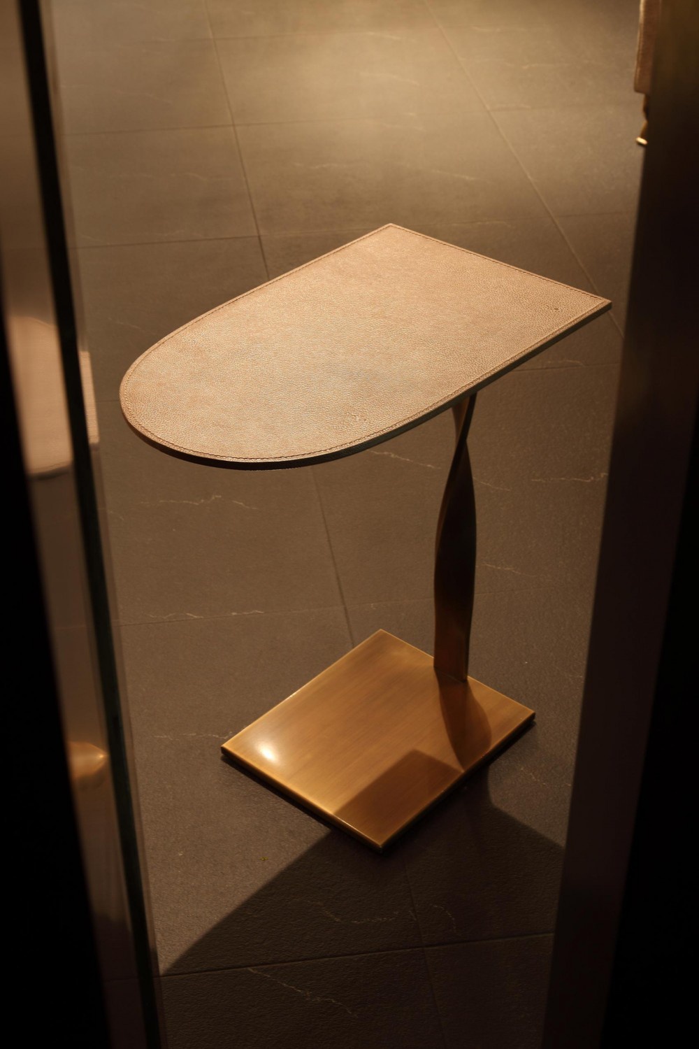 the base/counter top: bronze base: steel countertop: genuine leather countertop: painted |