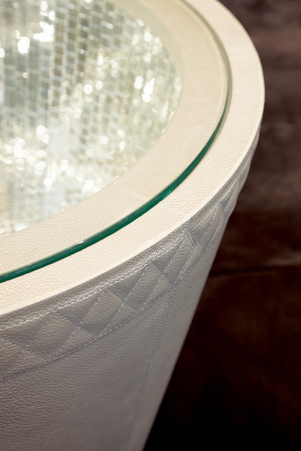Coffee table Basket from the Italian manufacturer Rugiano. The table frame is made of wood, covered with genuine leather, colors to choose from the range of the manufacturer. The tabletop is made of transparent glass. Inside a table decorated with mosaics of silver or gold. Table with LED illumination will perfectly fit into your interior.