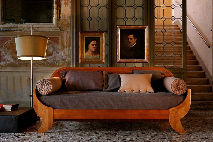 Sofa bed Letto Biedermeier from the Italian manufacturer Morelato. This sofa is made in a historically classic Biedermeier-style. Visible parts veneered beech. The role of arm rests are pillow-cushions. There are also decorative pillows. Colors in brown tones.