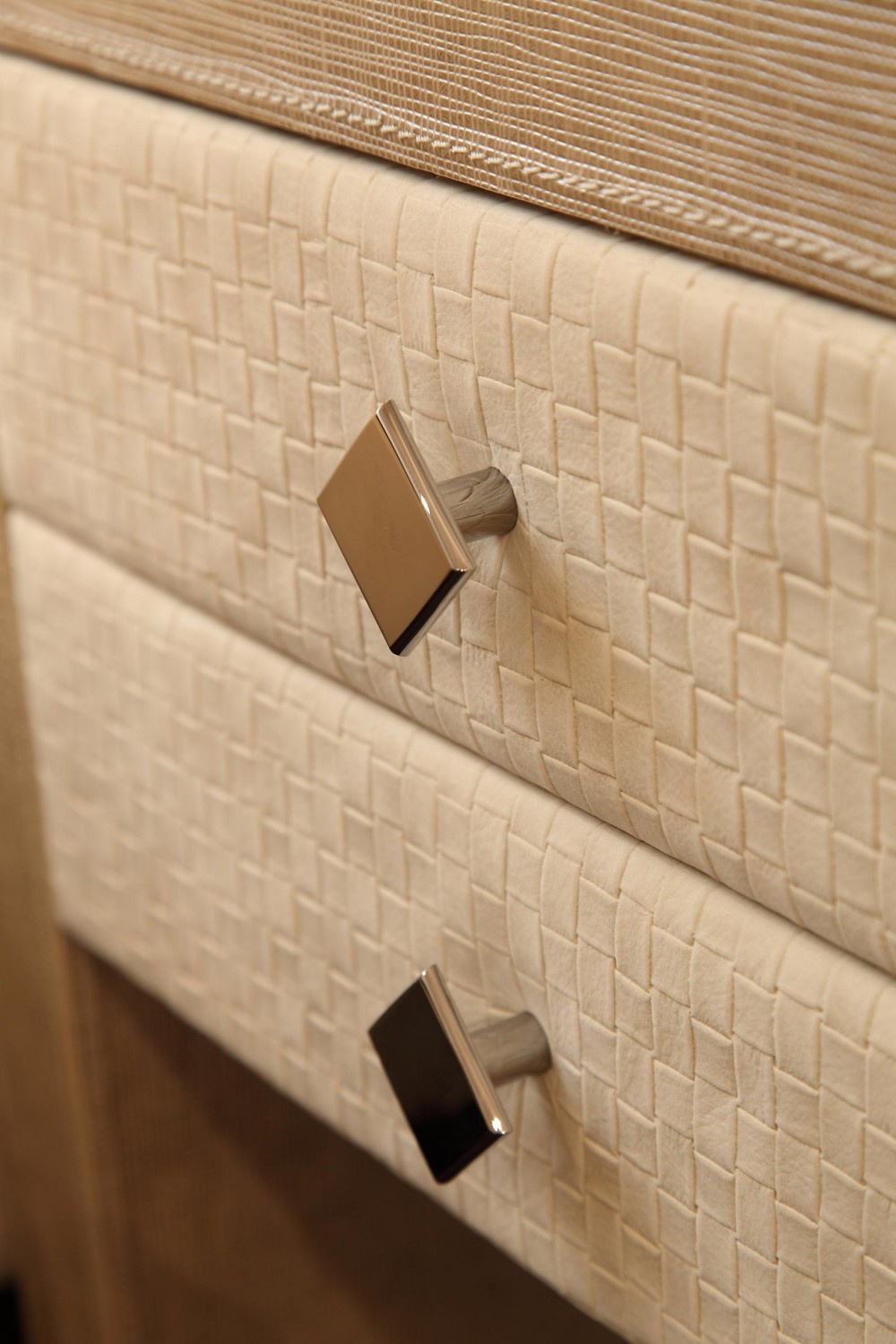 Bedside table with drawers Reko from the Italian manufacturer Rugiano. The frame is made from solid wood. The model includes 2 drawers, available model with 3 drawers. The leather trim colors to choose from a catalog company. Legs and handles are decorated with bronze or steel. The bedside table will adorn Your bedroom interior in modern style with elements of art Deco and glamour.