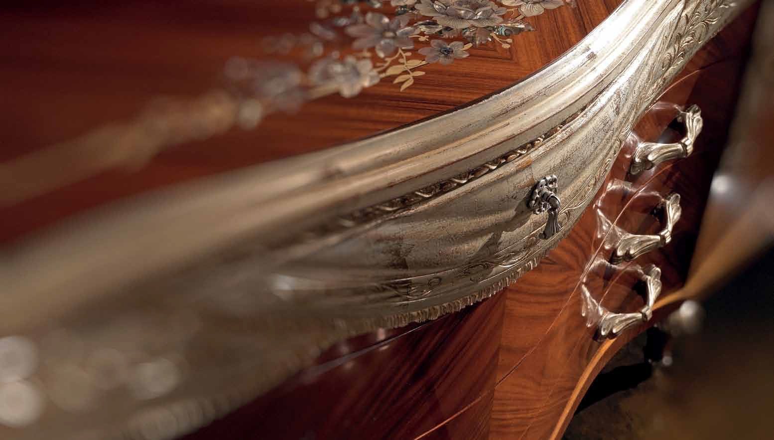 A chest of drawers from Italian manufacturer Jumbo Collection, collection Lace. Model in classic style with rich decor. The case of natural wood. The decorative elements are handmade in silver plated finish. Colours in stock.