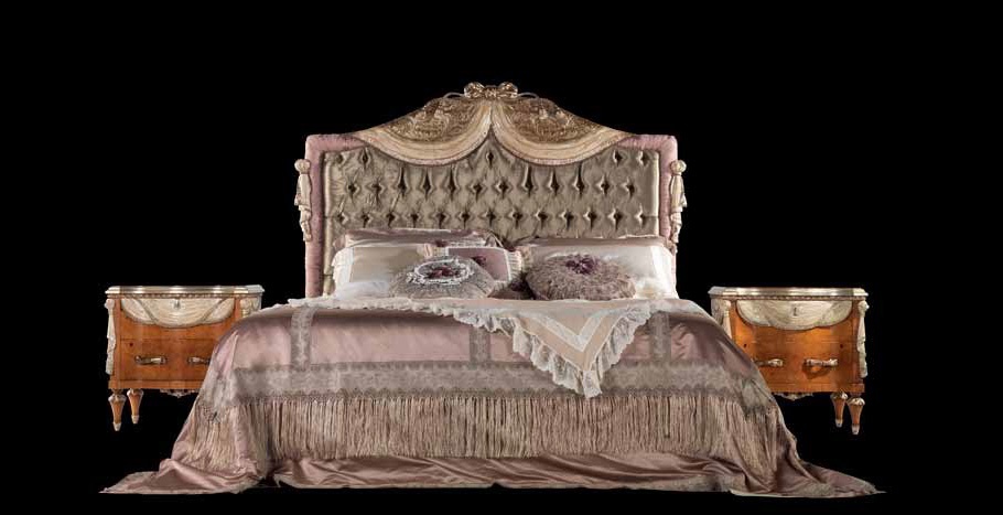 Double bed with upholstered headboard from the Italian manufacturer Jumbo Collection, collection Lace. Model in classic style with rich decor. The frame is made of wood. Decorative items handmade in gold plated finish. Headboard in fabric from the company portfolio. Colours in stock.