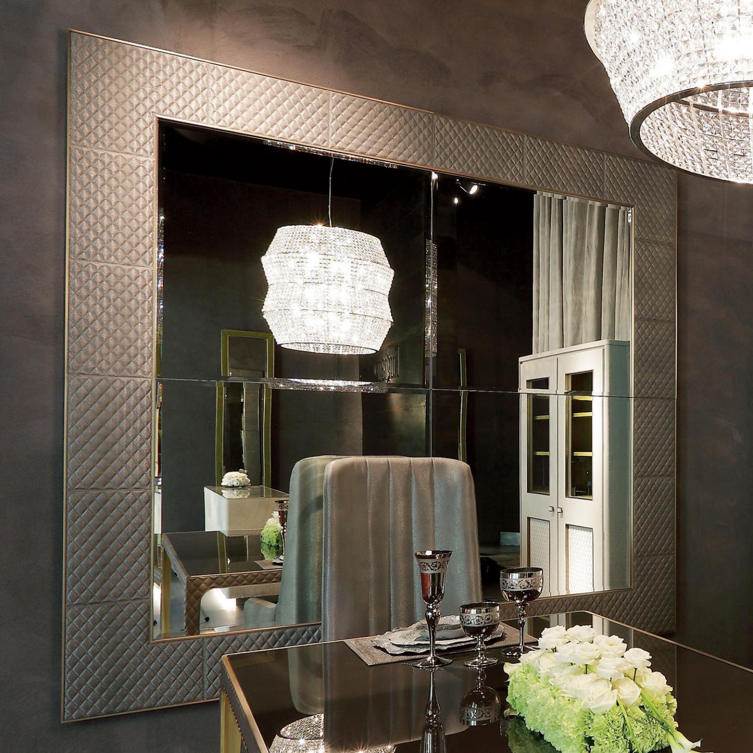 Mirror Honey from the Italian manufacturer Rugiano. The model square. The frame is made of bronze or steel. The surface is upholstered with leather or textiles from the collection of colours to choose from. The mirror consists of four squares. Great addition for your living room, dining room or bedroom in modern style with elements of art Deco.