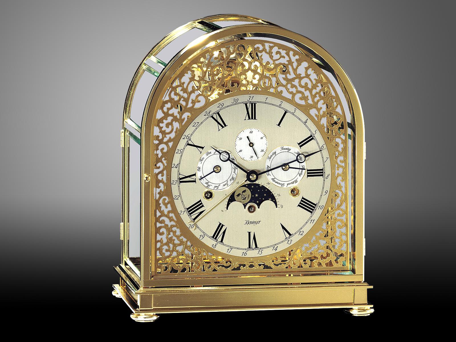 Clock table from the American manufacturer Kieninger. Majestic with a frame made of solid brass plated with 24-carat gold. Seven beveled and partly curved crystal of the parties to form a dome above the precious bell. Model two door, silver plated dial with calendar and with a pointer date display, day, week and month. Easy adjustment of all functions.