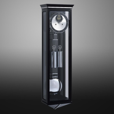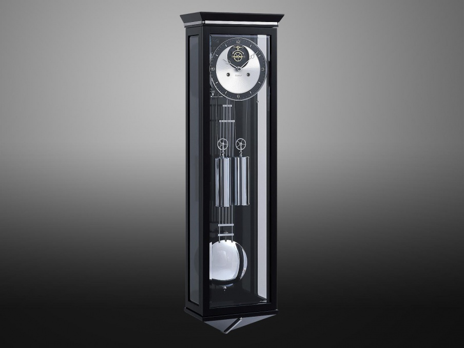 Wall clock from Kieninger American manufacturer. Special license plates with unique chrome accents. The body is glossy black. Silver plated dial with superbly designed open indicator. At the end of the design chromed pendulum with precision adjustment. Used modern materials and technologies.