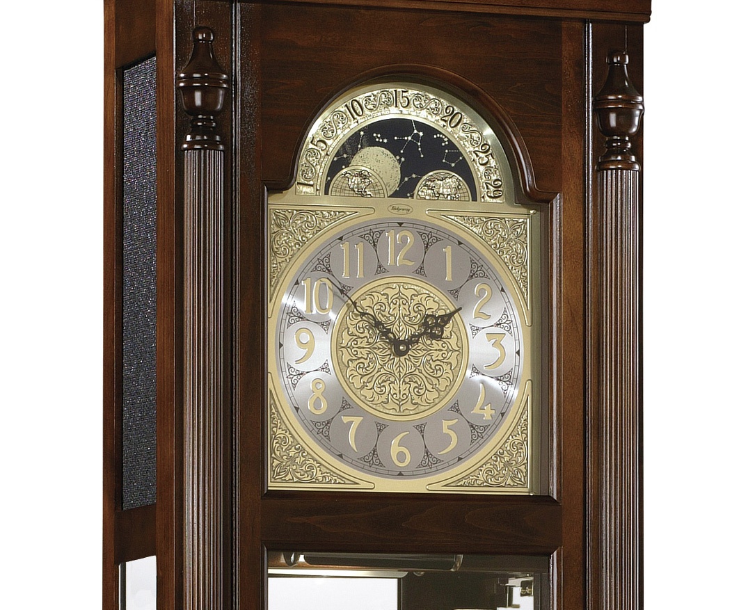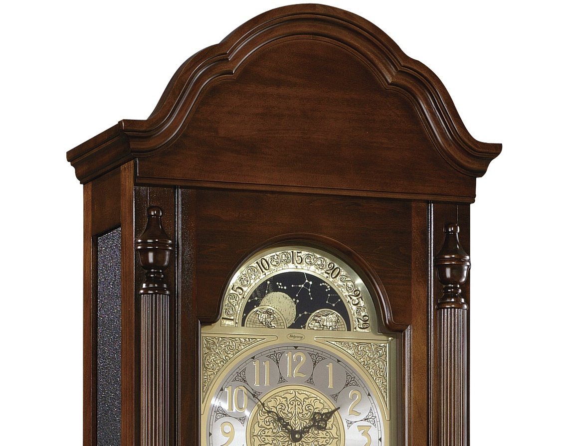 Watch outdoor from Clarksburg American manufacturer of Ridgeway. Classic model made of solid wood with carved case. The model performing the function of the showcase with three shelves. Light reflects in the glass and is the perfect display for collectibles. The door and sides beveled crystal glass. The mechanism is made of brass. Quartz dial with plated parts from gold and silver are found.